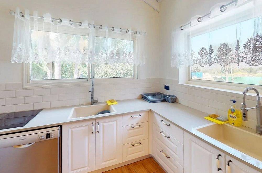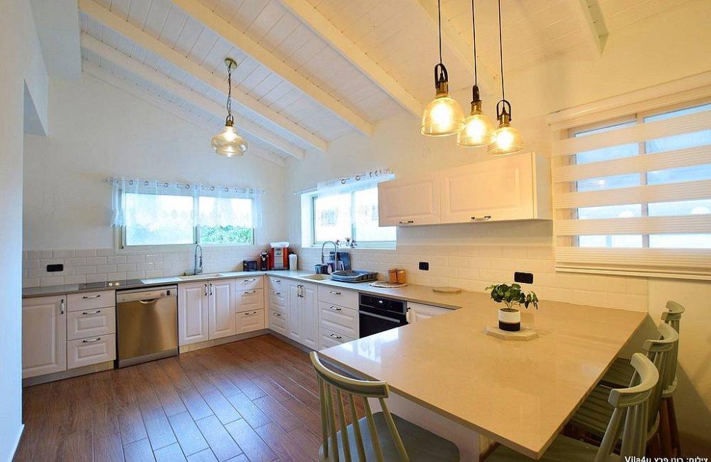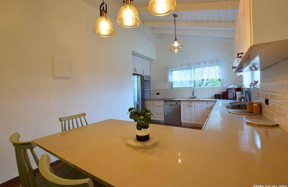 מטבח מאובזר הכולל: מקרר, 2 כיורים, מדיח כלים, כיריים חשמליות, תמי 4, כלי אוכל והגשה
