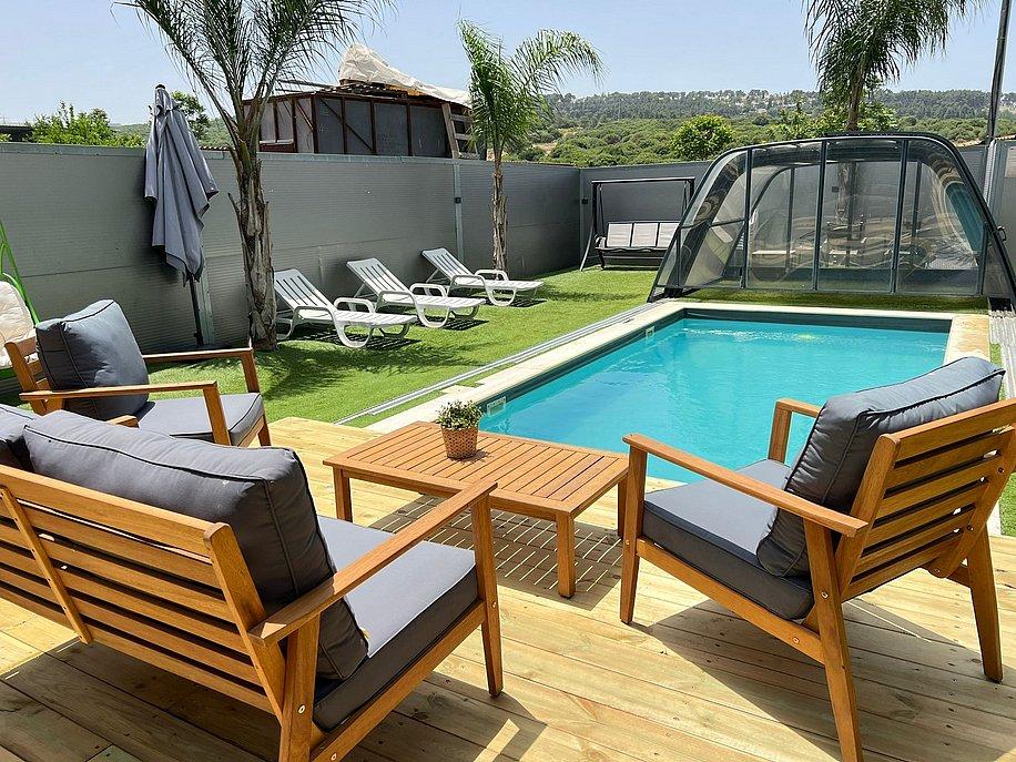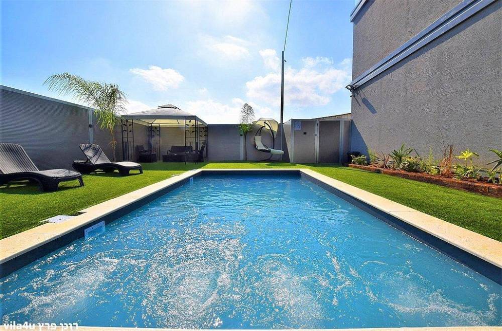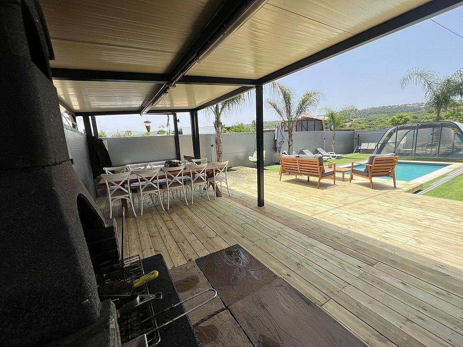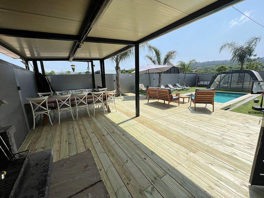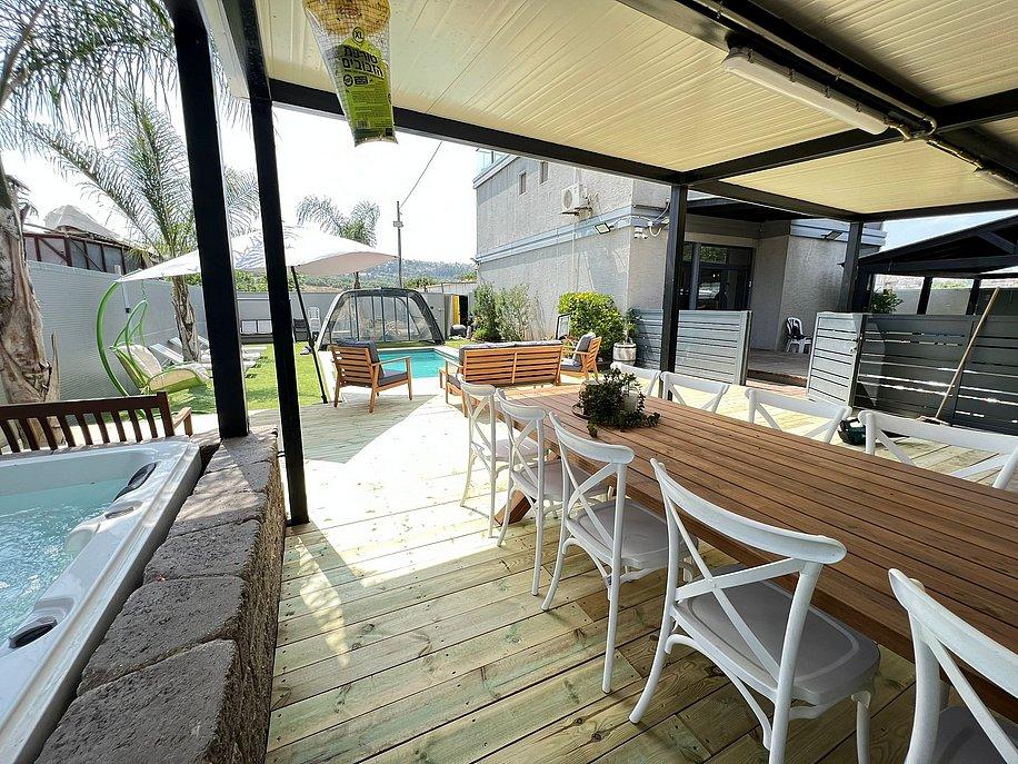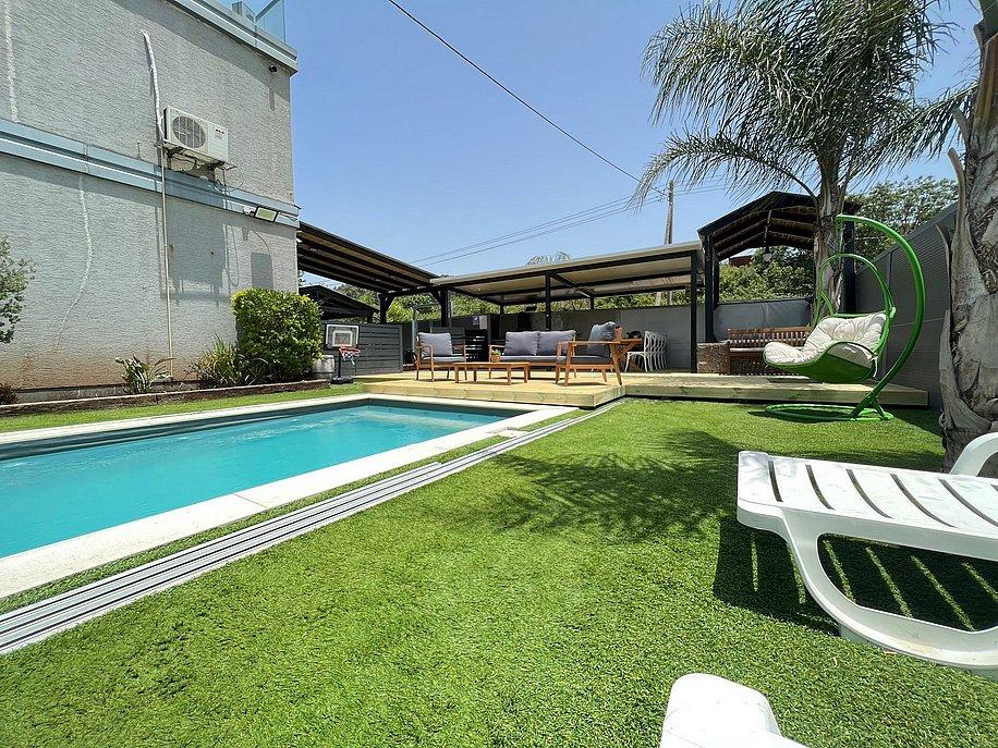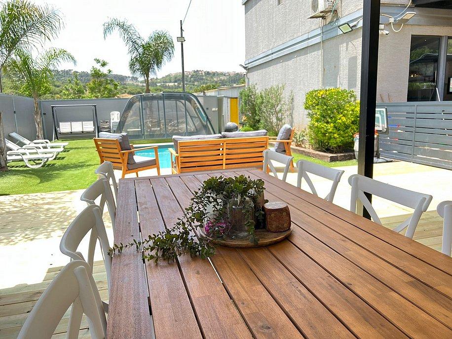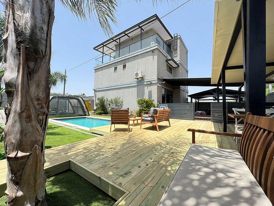 חצר גדולה עם מתחם דק ובריכת שחייה