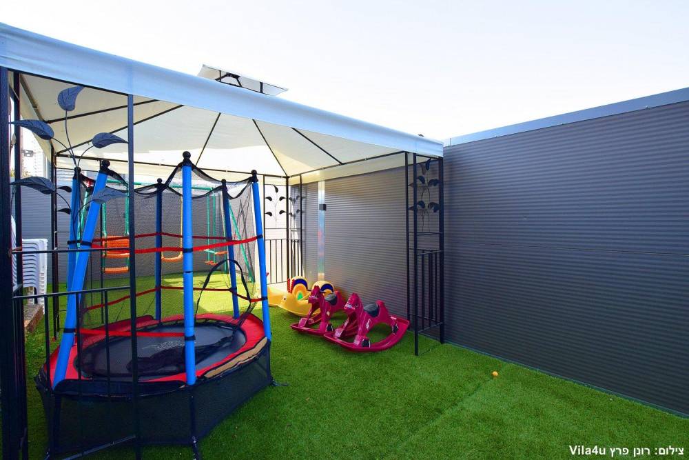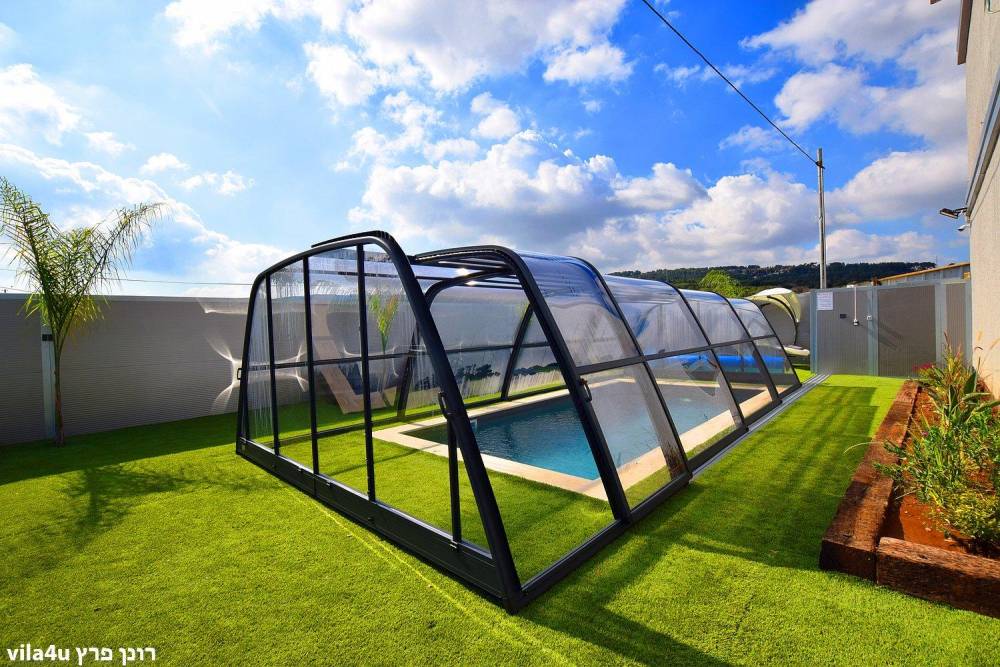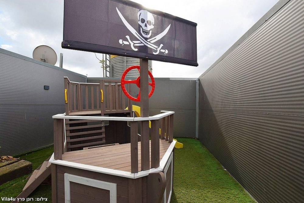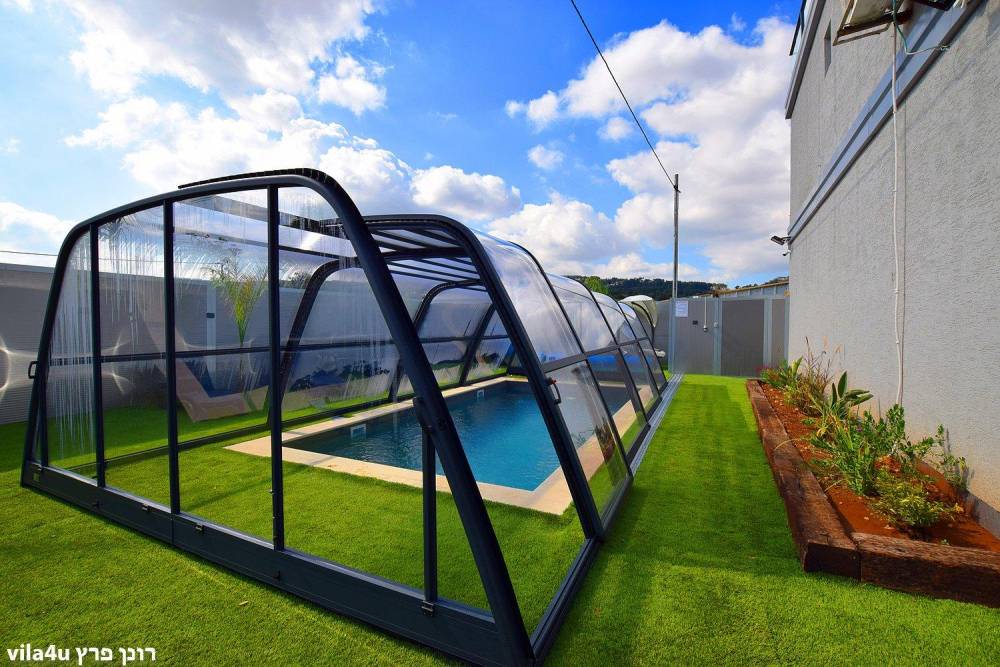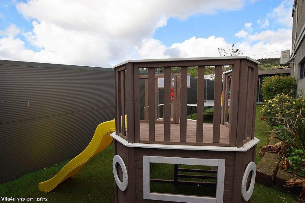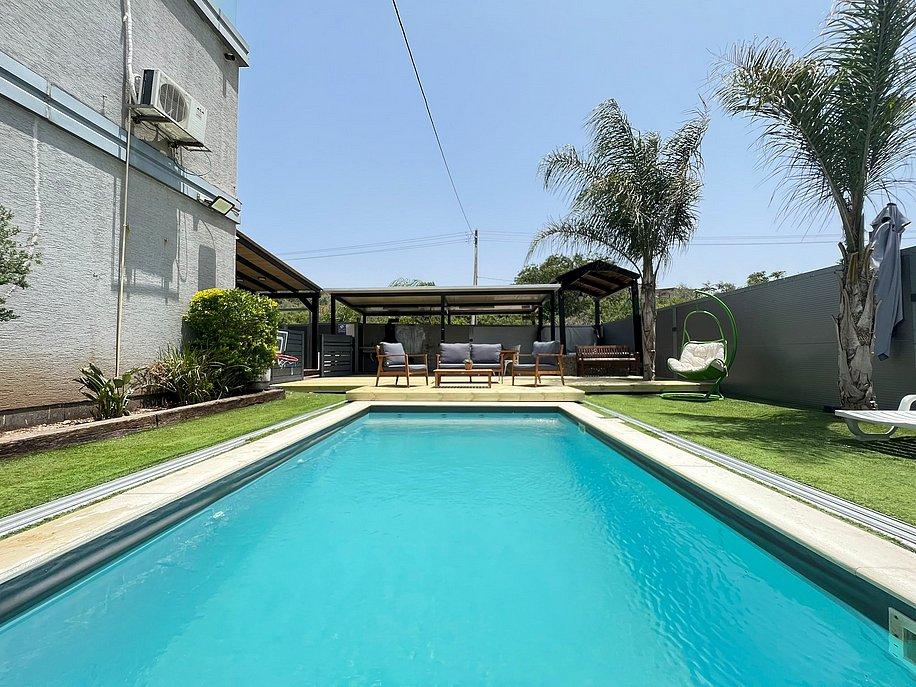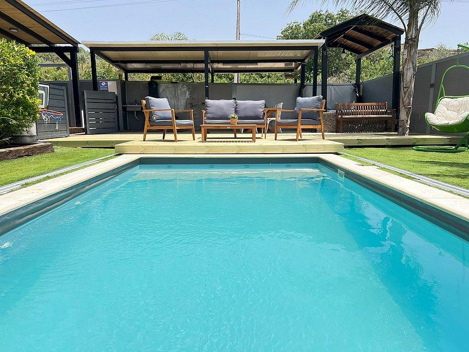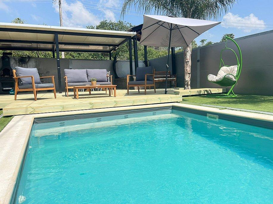 חצר גדולה עם מתחם דק ובריכת שחייה