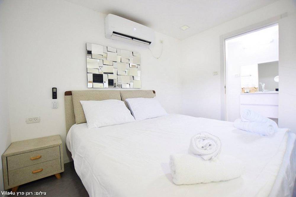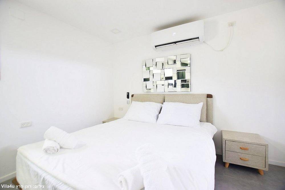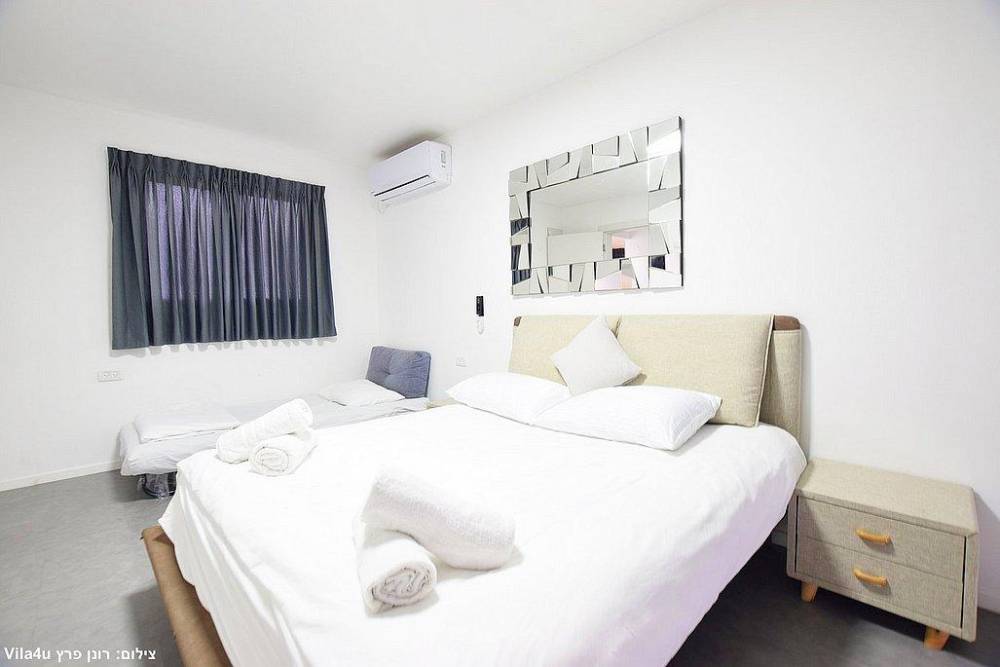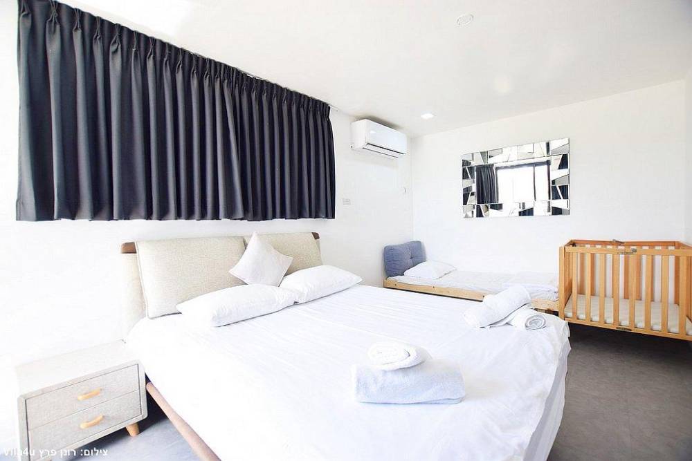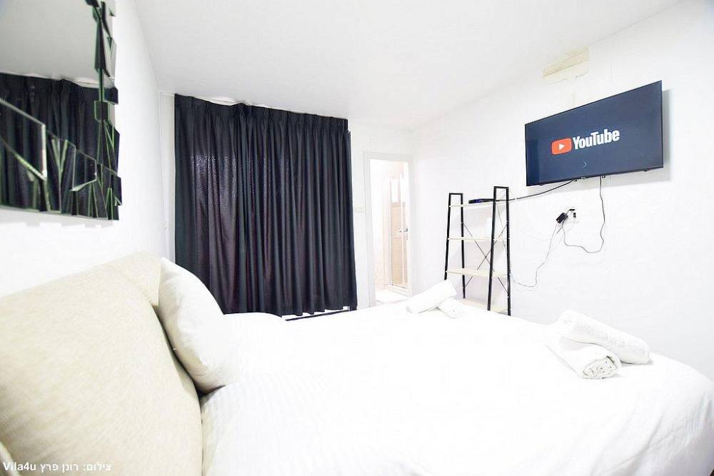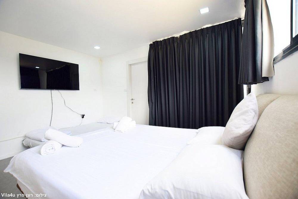 אבזור חדרי השינה: מיטה זוגית, מיזוג אוויר, שידה, מסך צפייה 49 אינץ' (טלוויזיה מקומרת)
