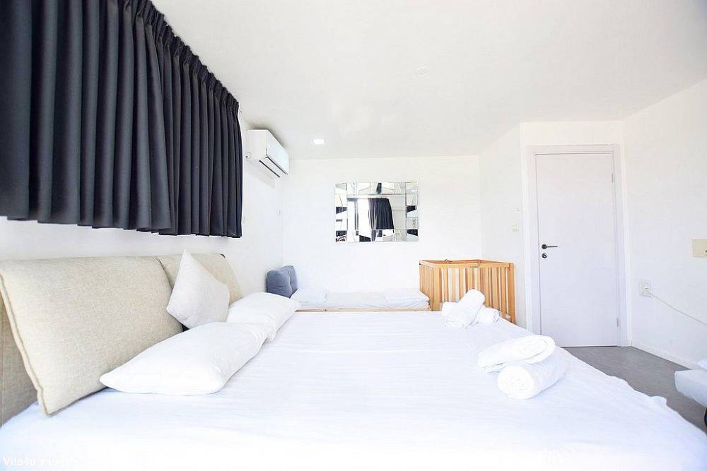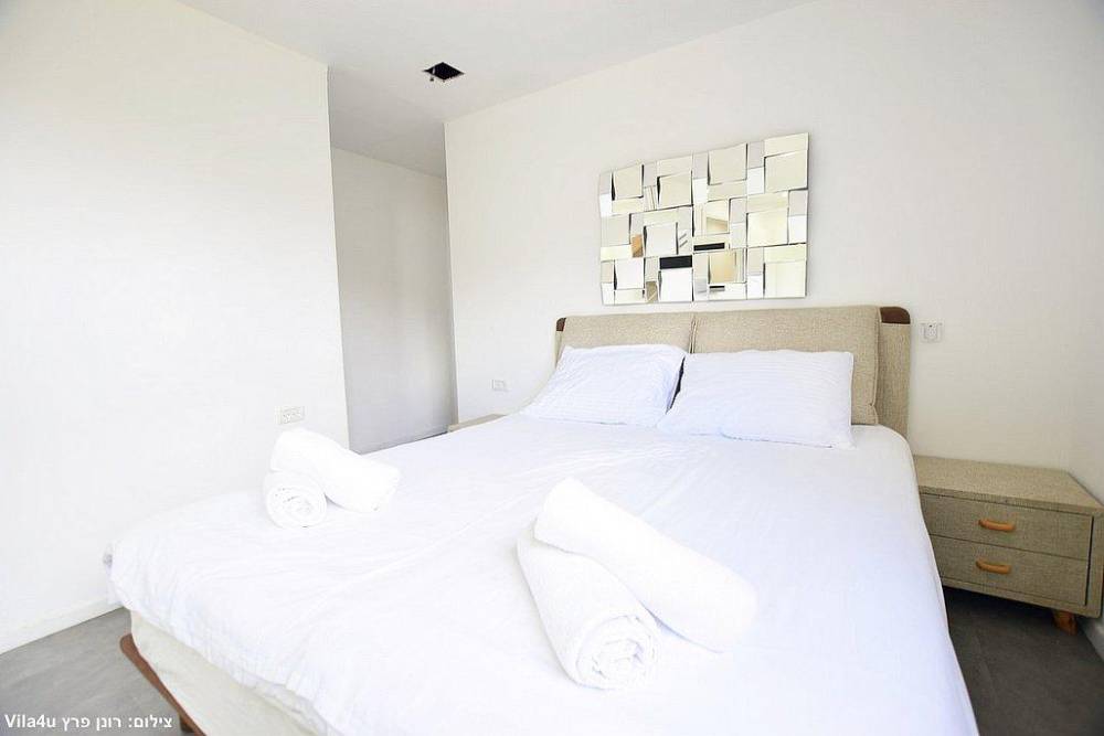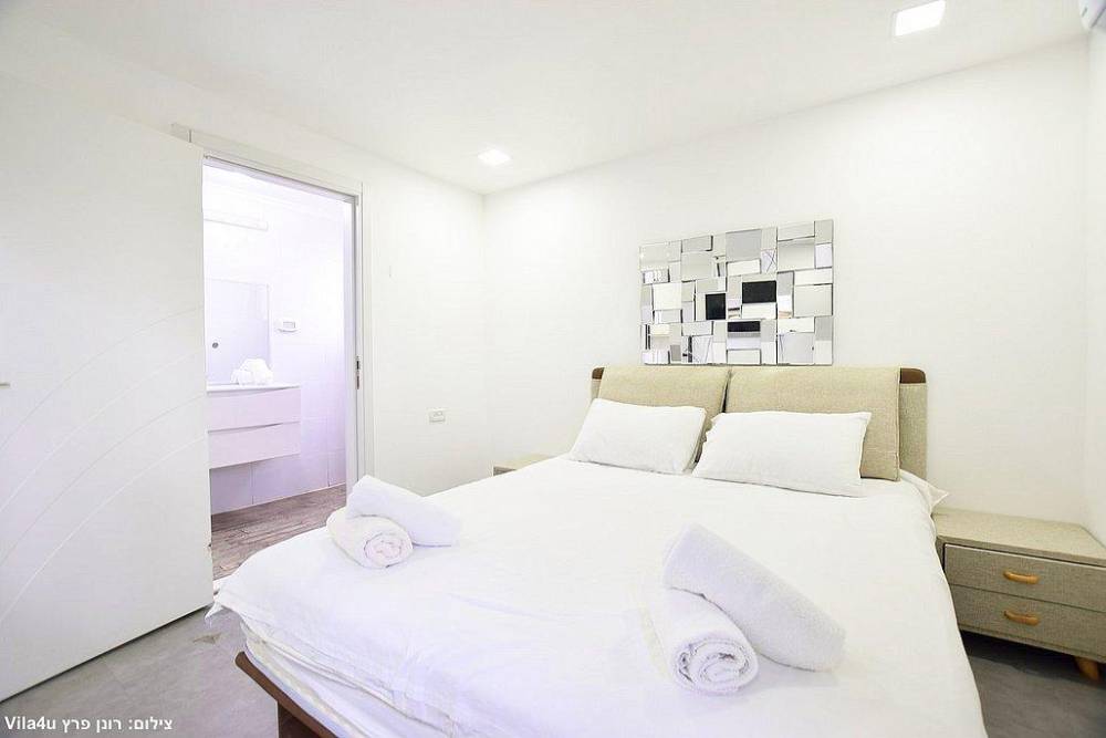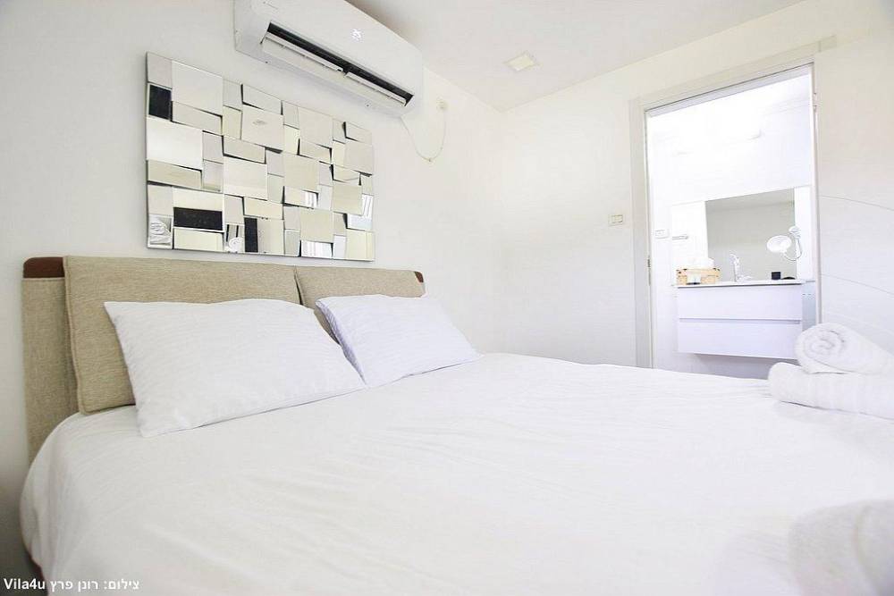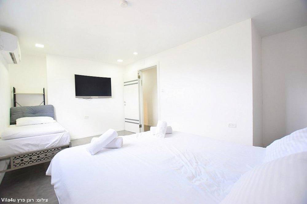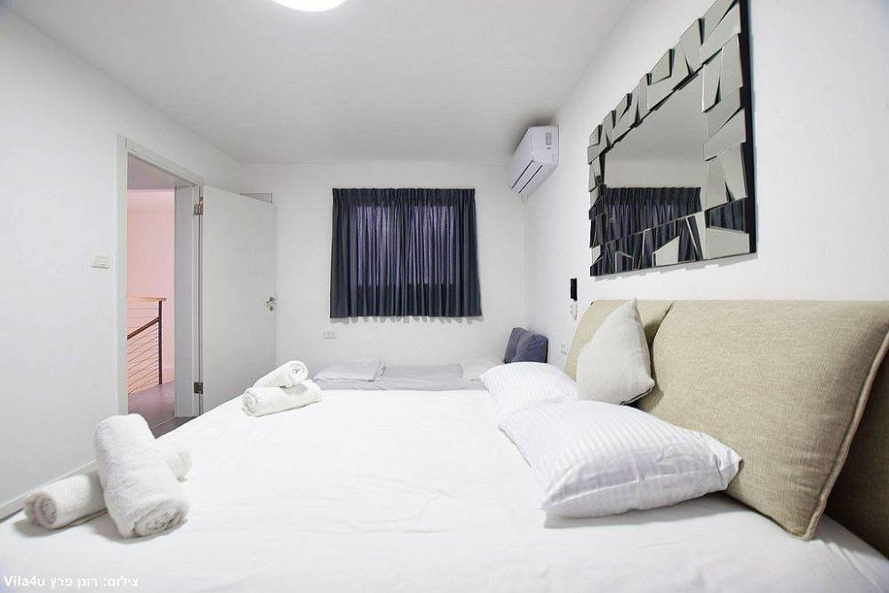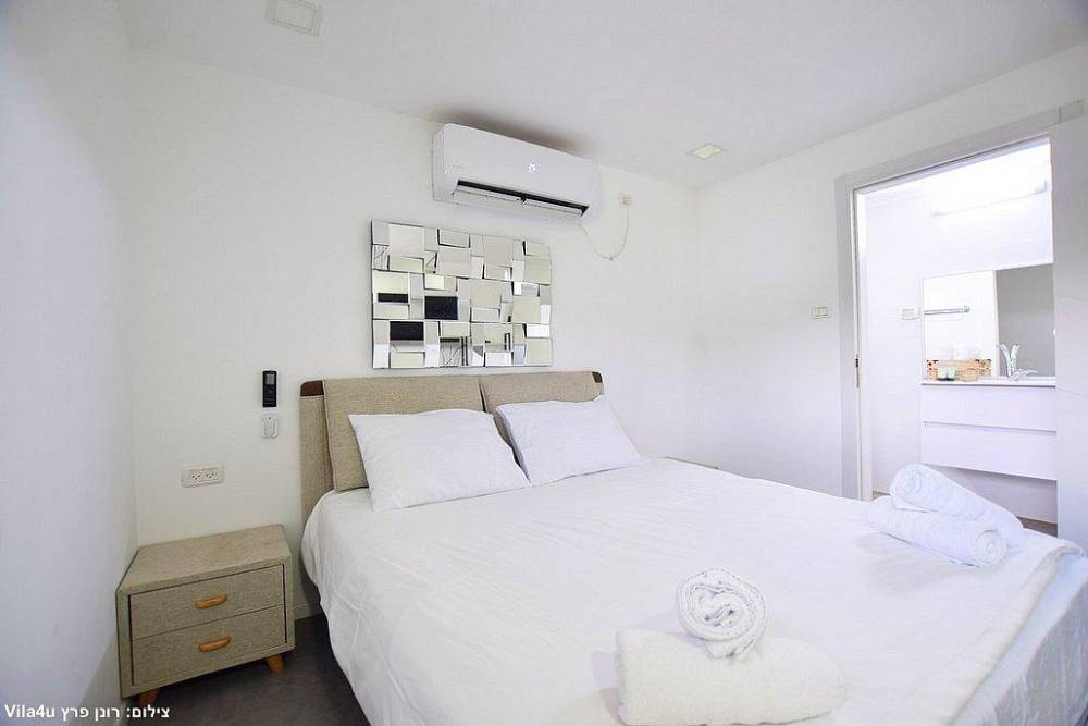 אבזור חדרי השינה: מיטה זוגית, מיזוג אוויר, שידה, מסך צפייה 49 אינץ' (טלוויזיה מקומרת)