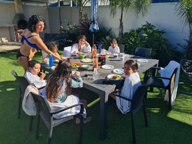 פינת אוכל מוצלת תחת גזיבו ופינת אוכל נוספת לצד עמדת הברביקיו