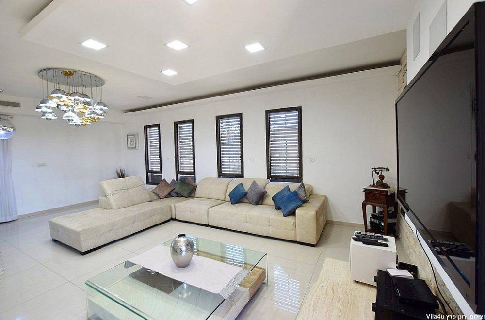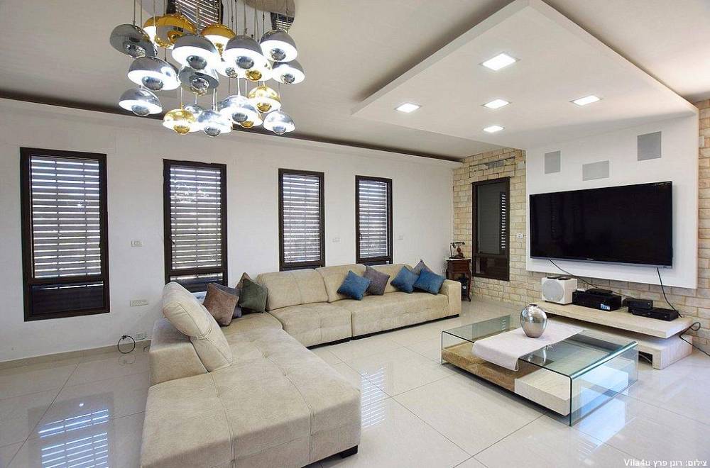 סלון מעוצב עם מערכות ישיבה, ספות וטלוויזיה