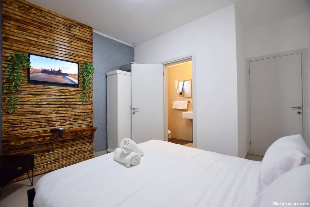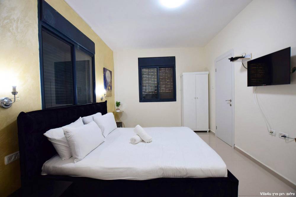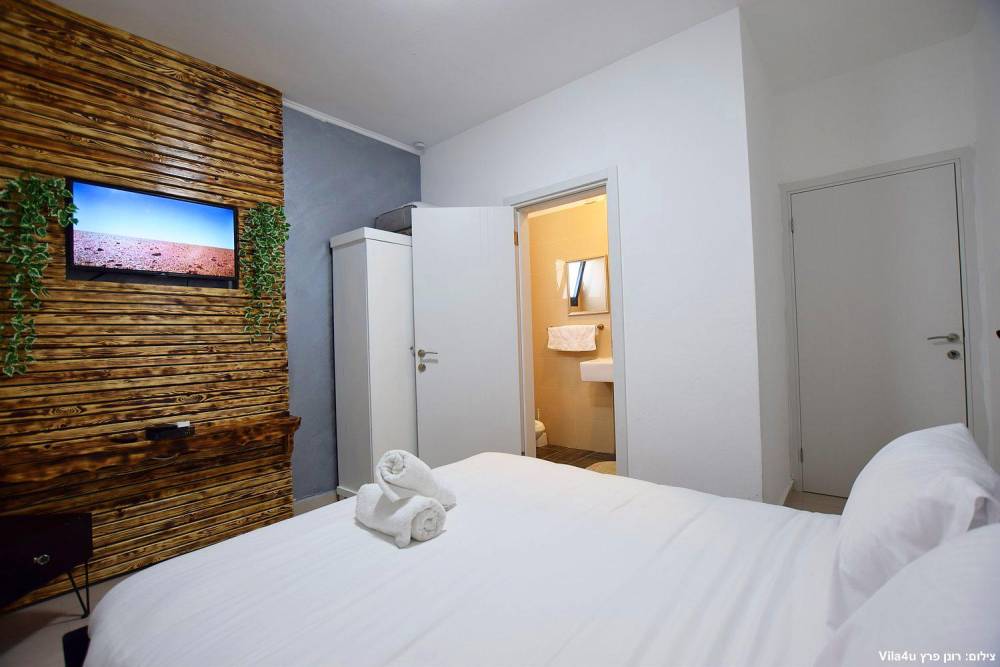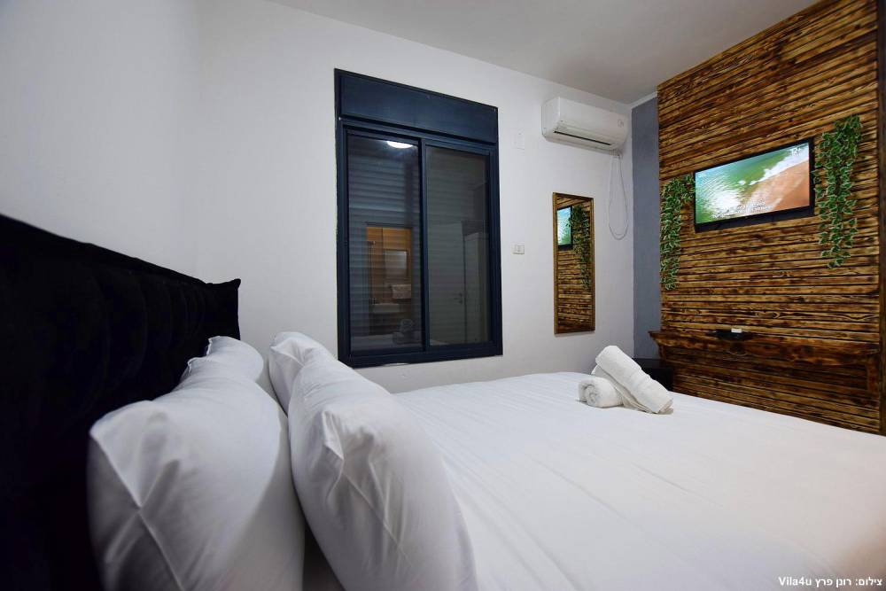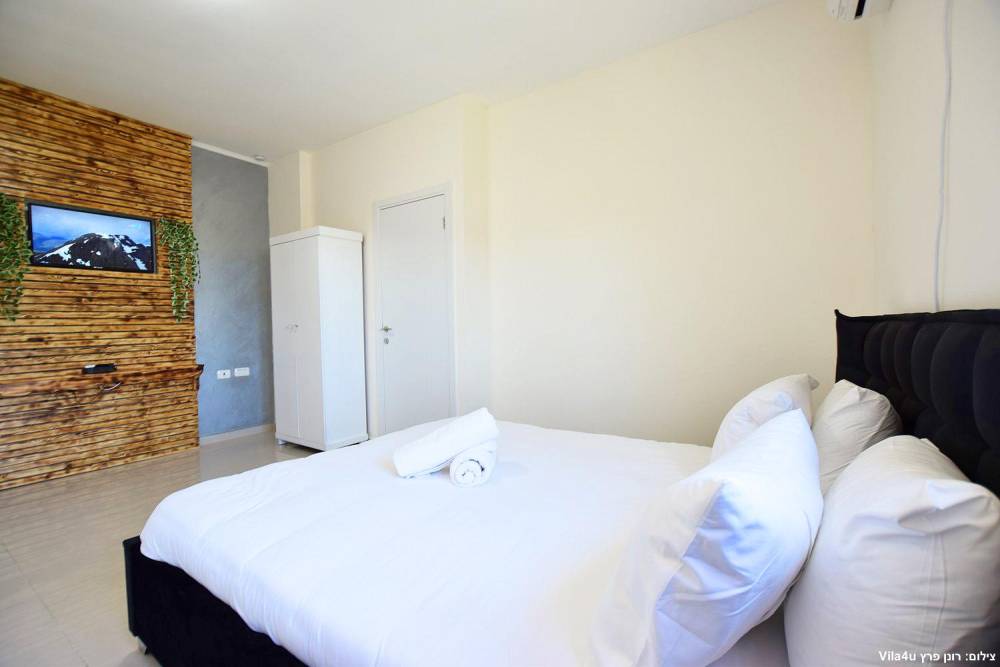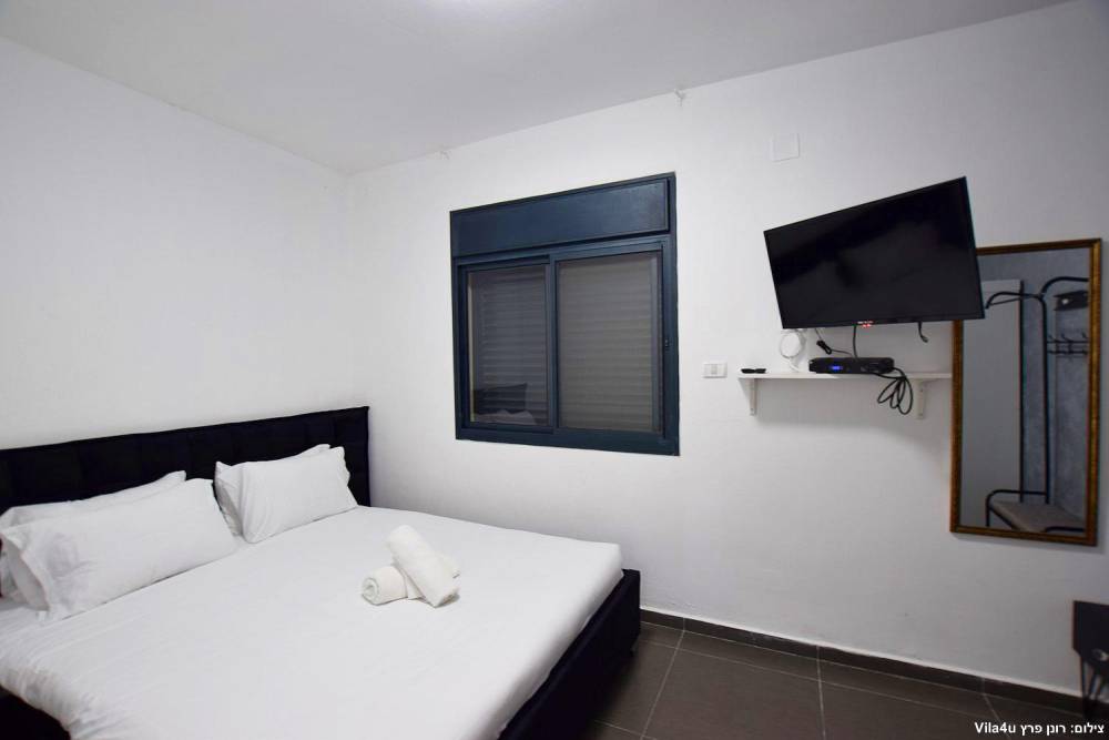 אבזור חדרי השינה- מיטה זוגית מוצעת, מיזוג אוויר, טלוויזיה, שידת אחסון.