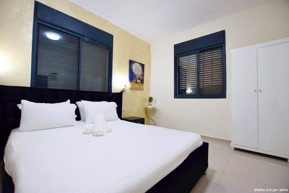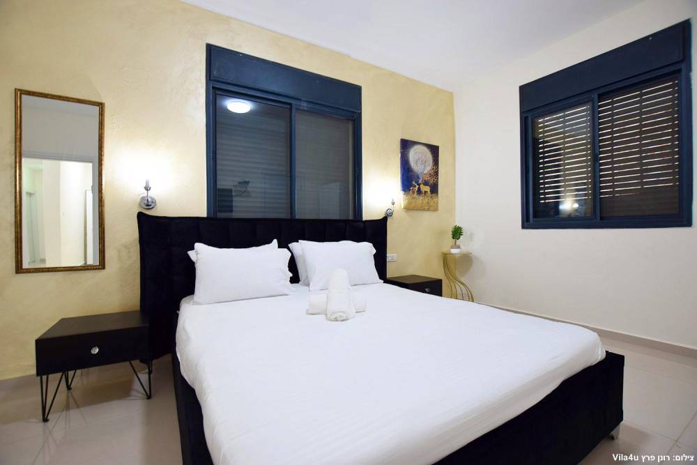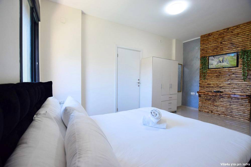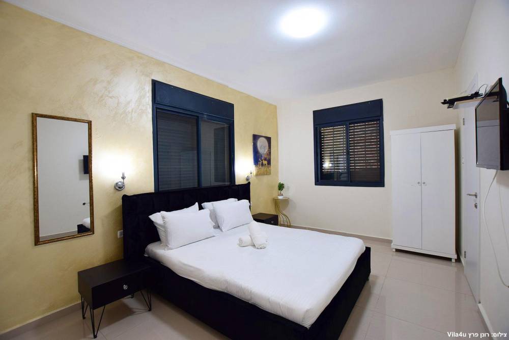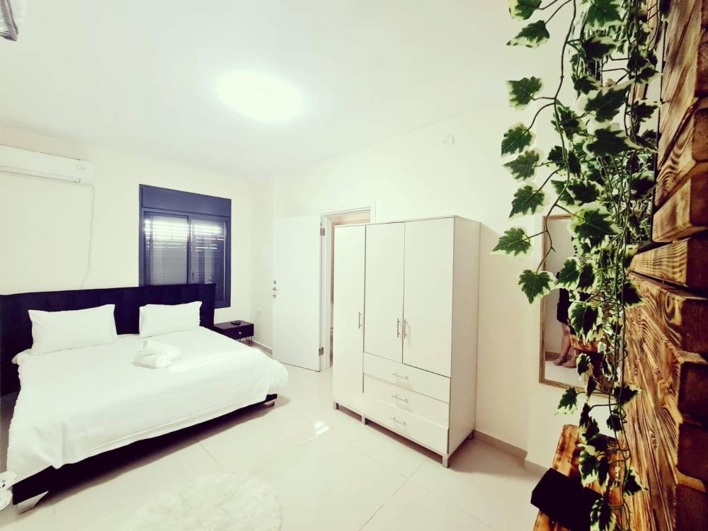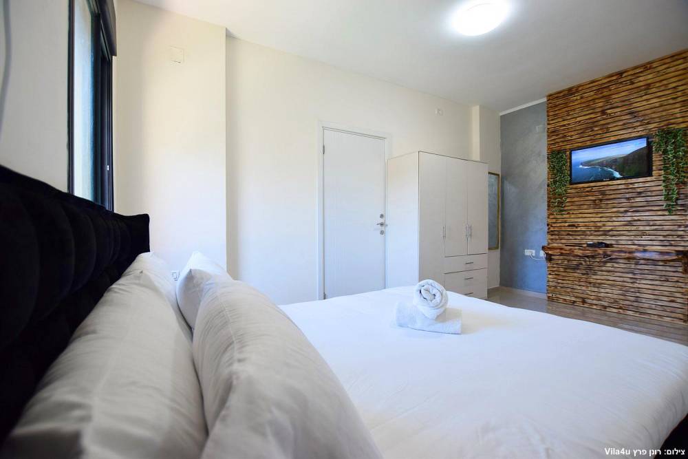 אבזור חדרי השינה- מיטה זוגית מוצעת, מיזוג אוויר, טלוויזיה, שידת אחסון.