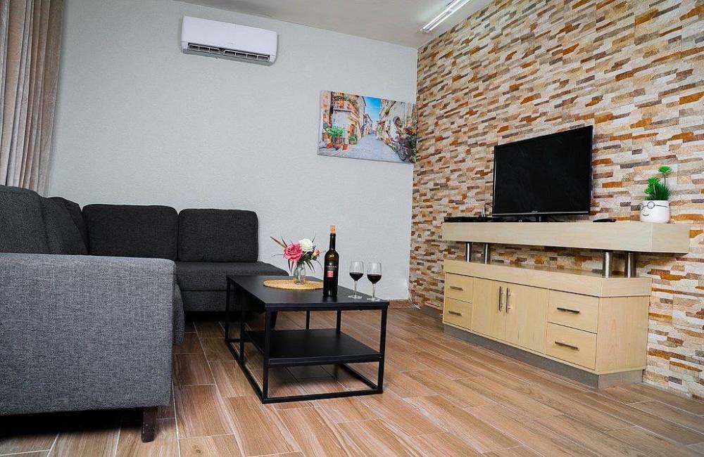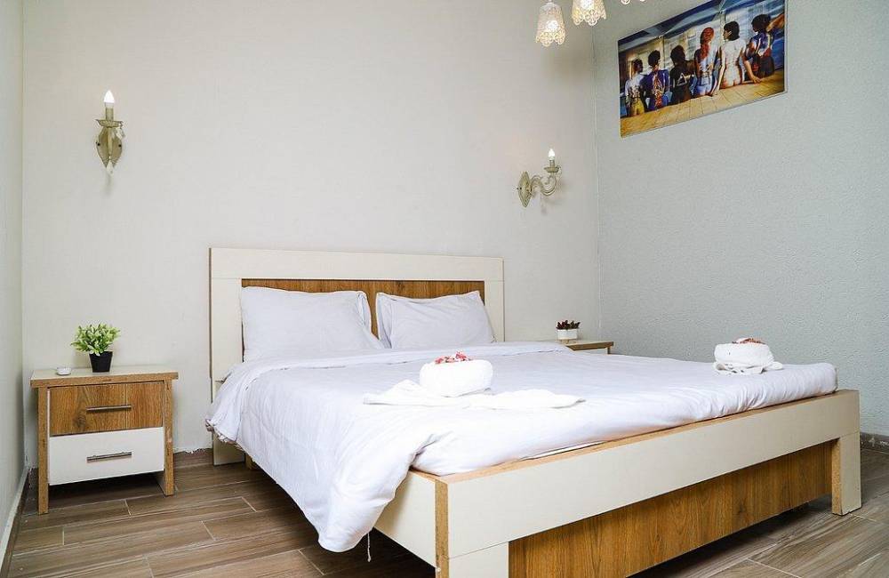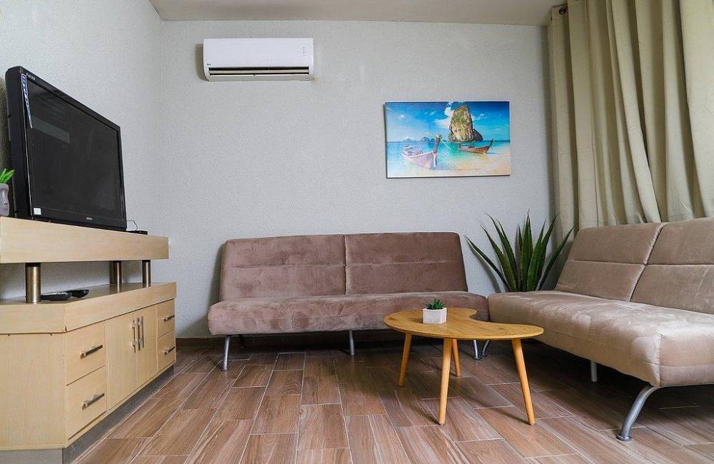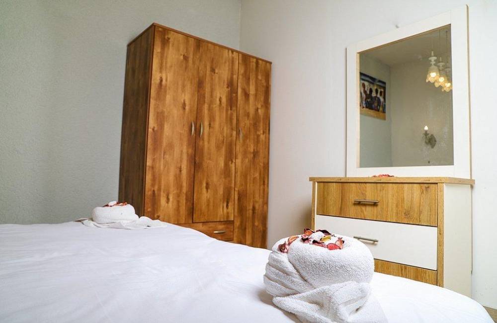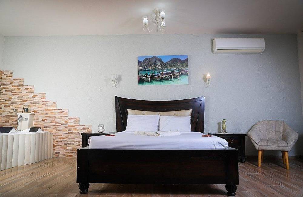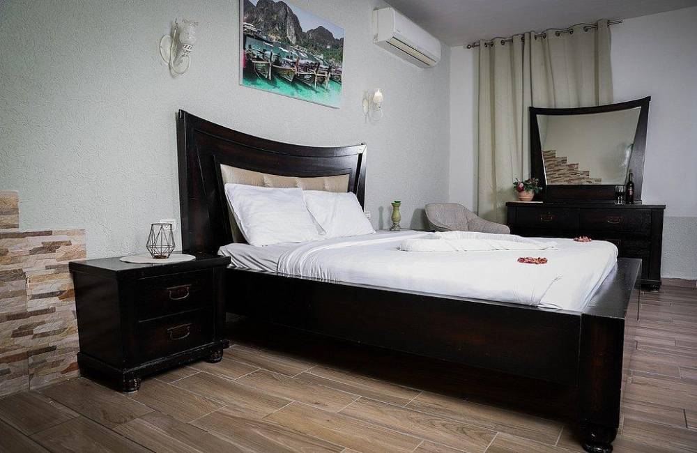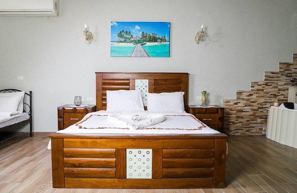 מיטה זוגית, מסך LCD בגודל 36 אינץ מחובר ל- YES מזגן, שידות וארון בגדים