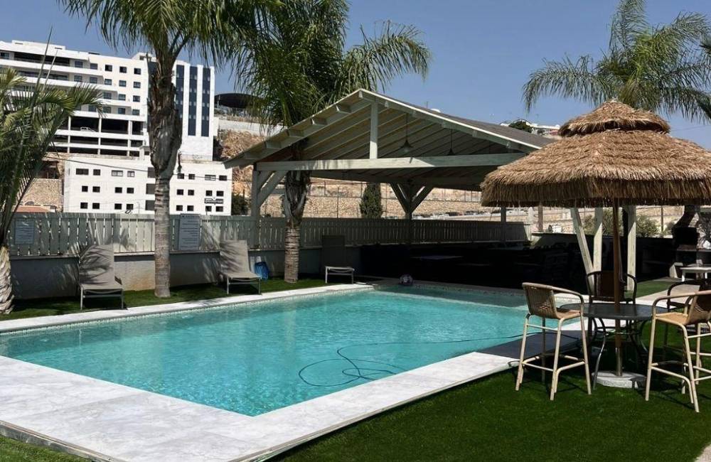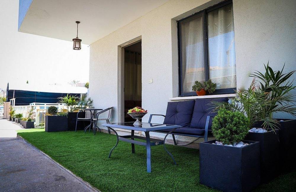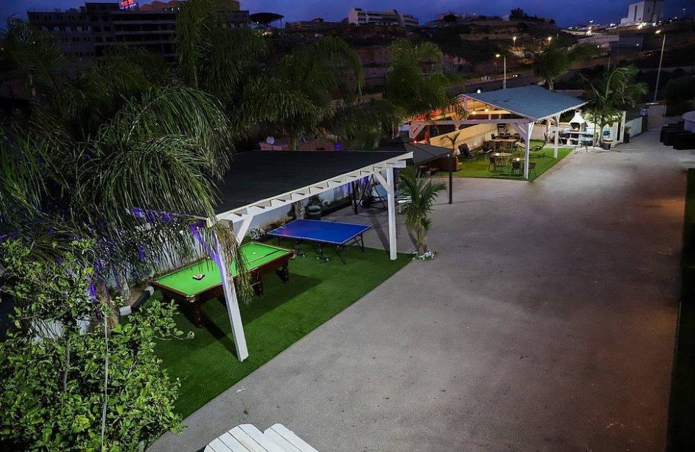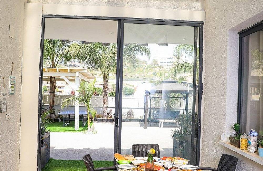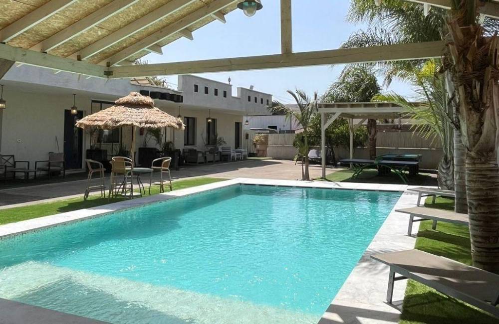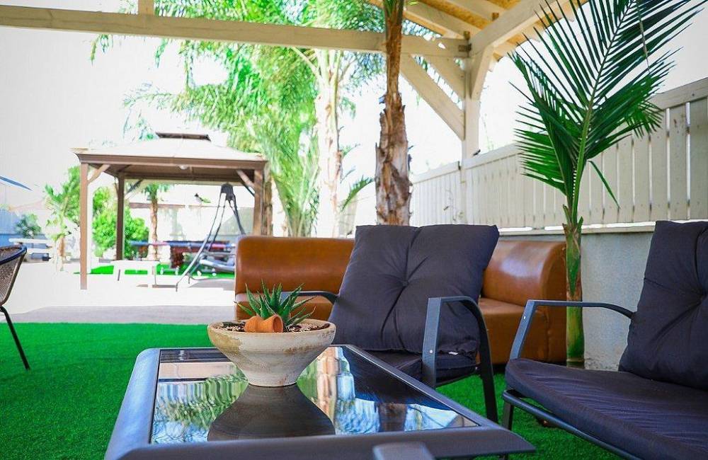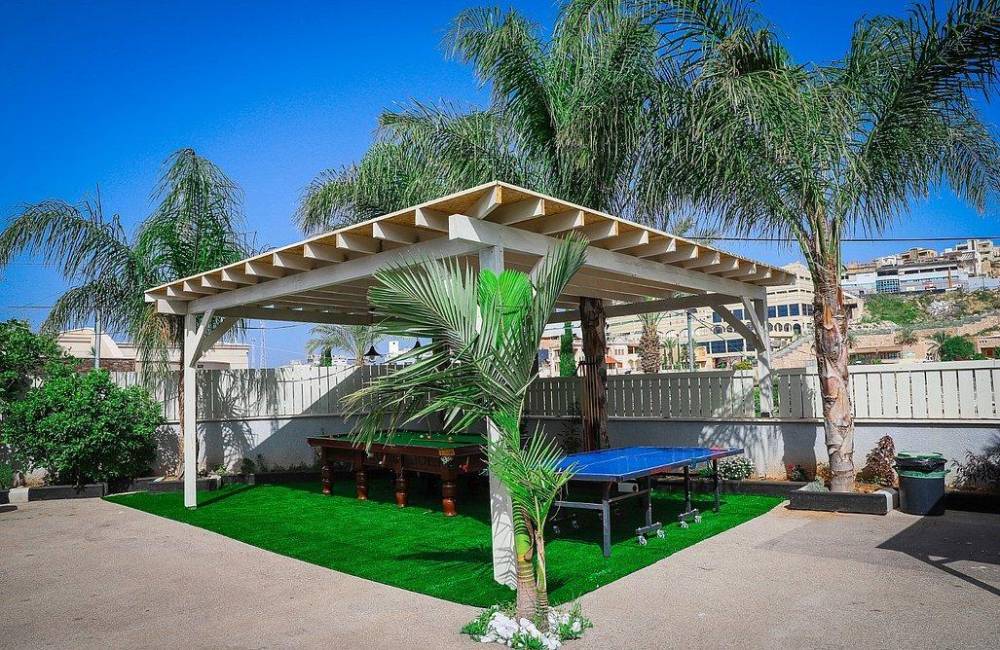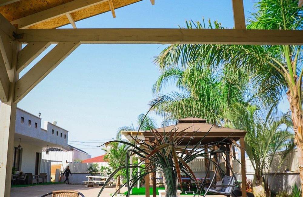 חצר מהממת עם פינת פרגולה ענקית, ערסלים מיטות שיזוף ונדנדות
