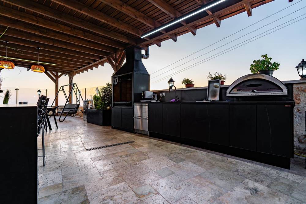פינת מנגל מקורה עם מטבח חיצוני מאובזר הכוללת טאבון, כיור, משטח עבודה, מנגל מקצועי, 2 פינות אוכל ומערכת ישיבה.