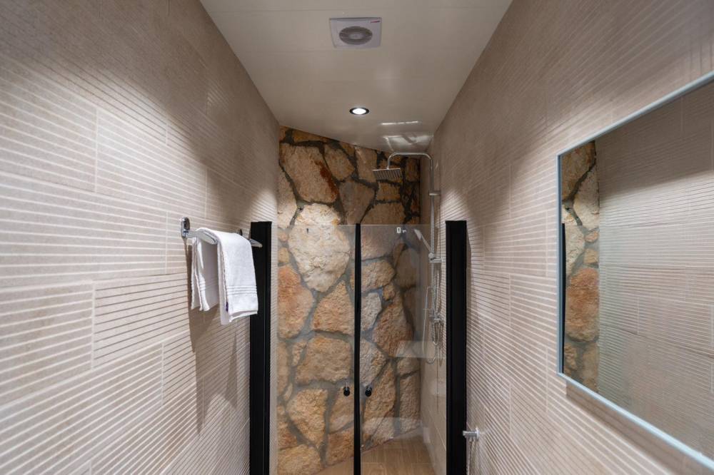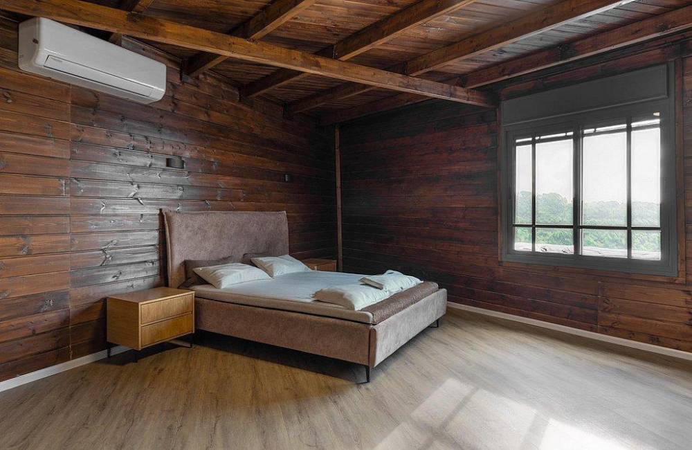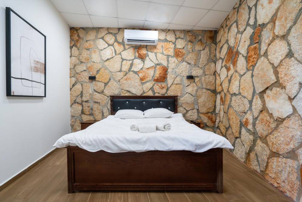 5 חדרי שינה המכילים: מיטה זוגית, מיזוג אוויר, טלוויזיה ושידות אחסון.