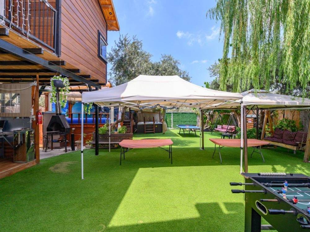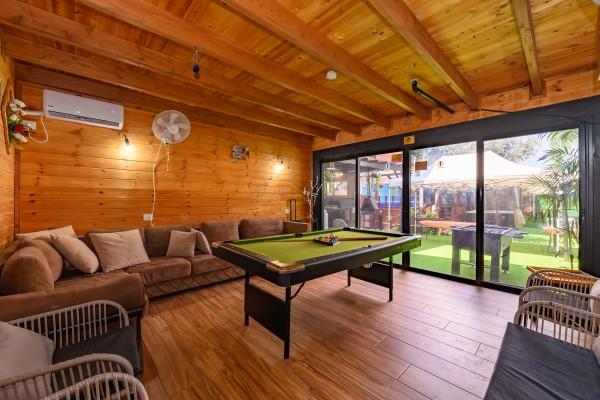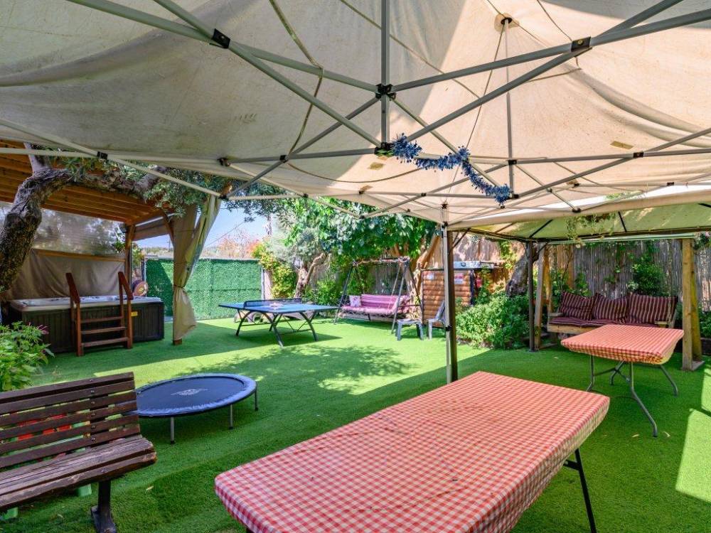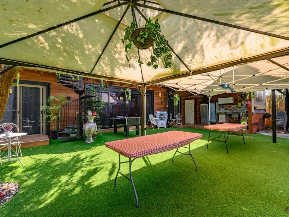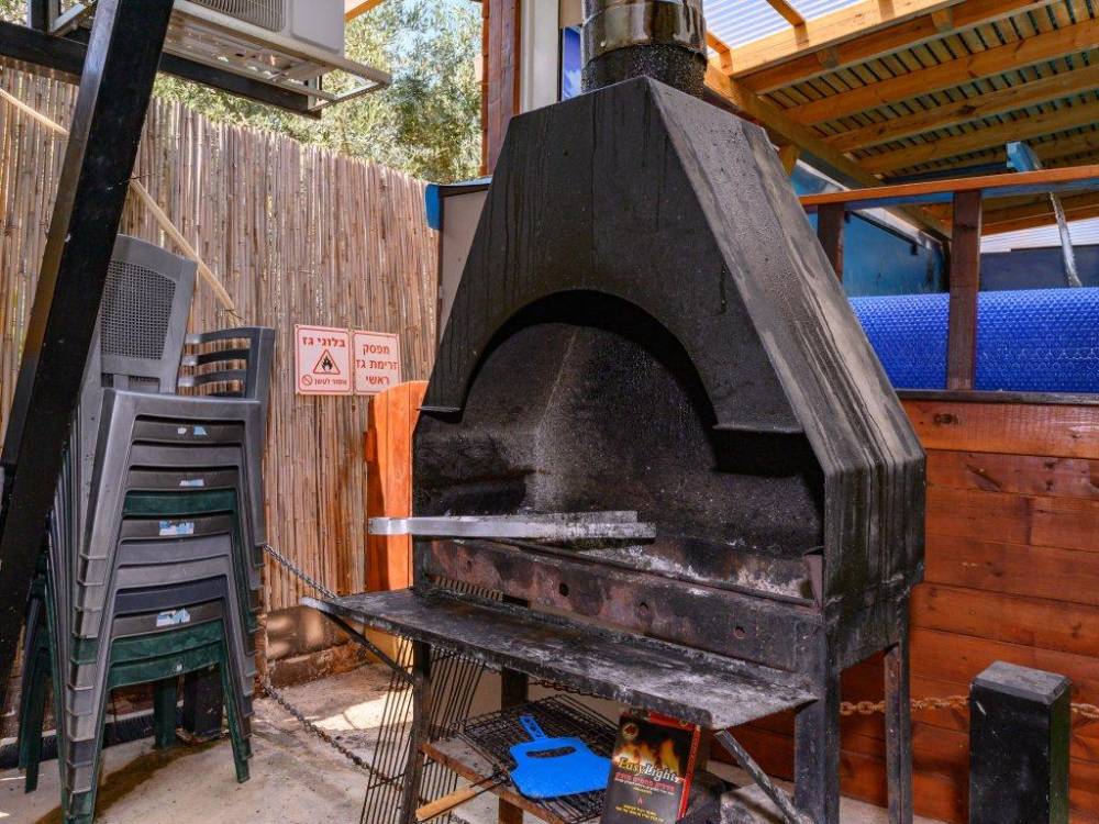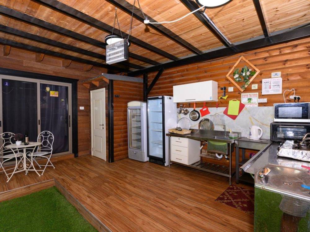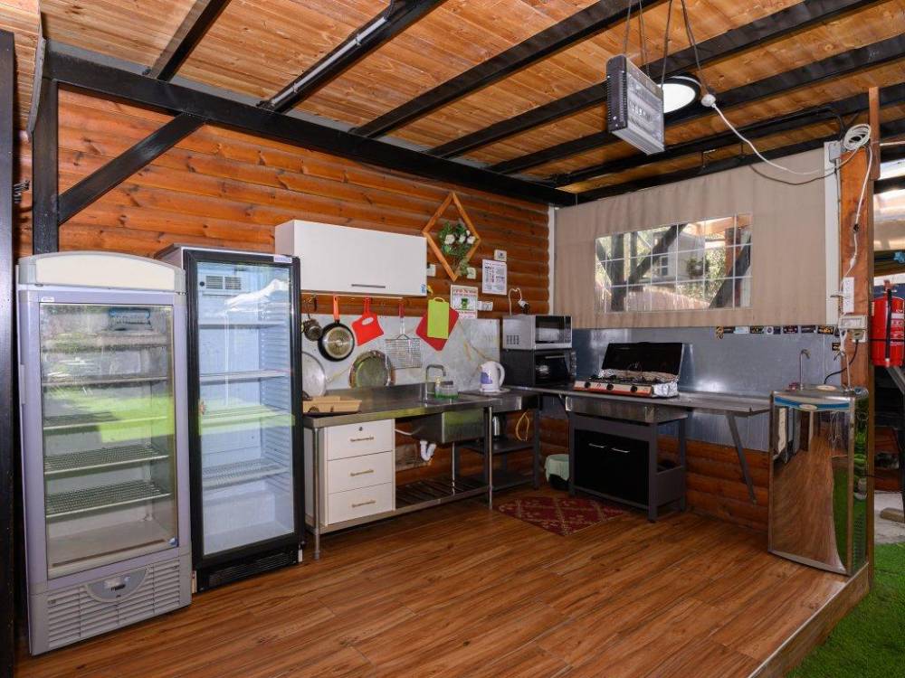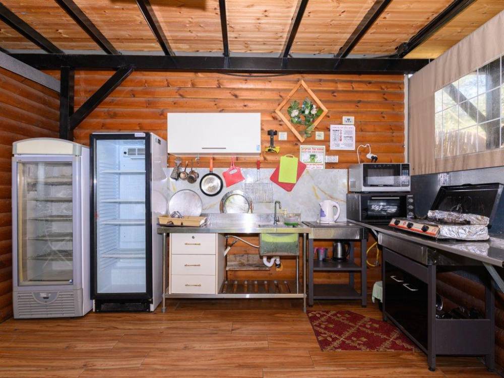 פינת מנגל מקצועית עם מטבח מאובזר- מקרר גדול, כיור ומיקרוגל