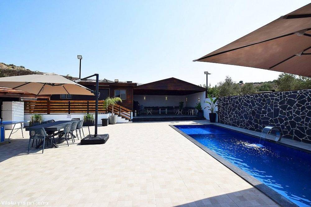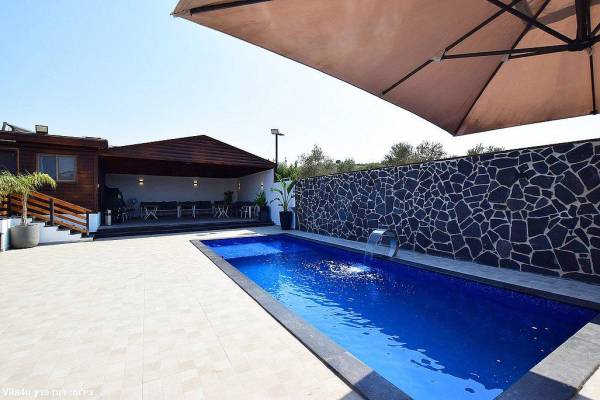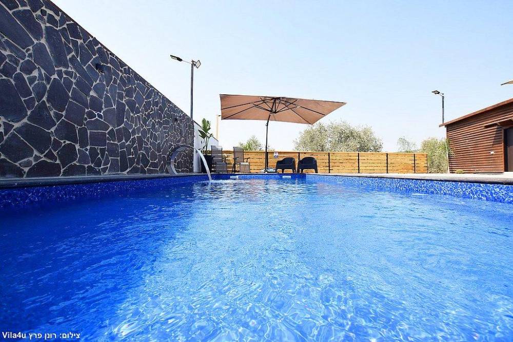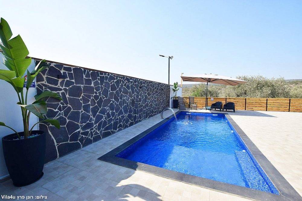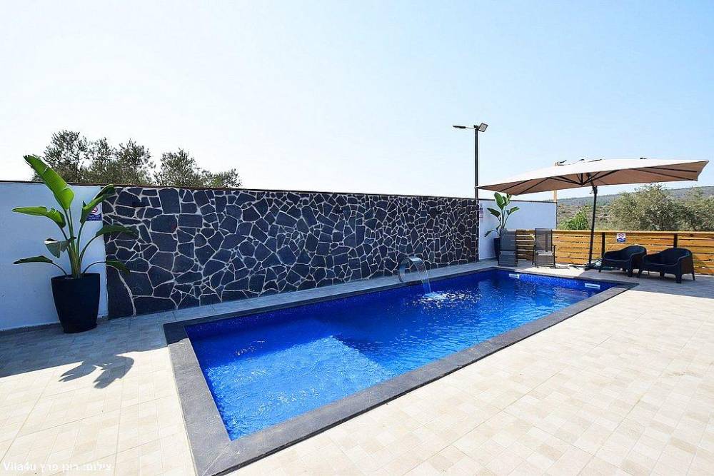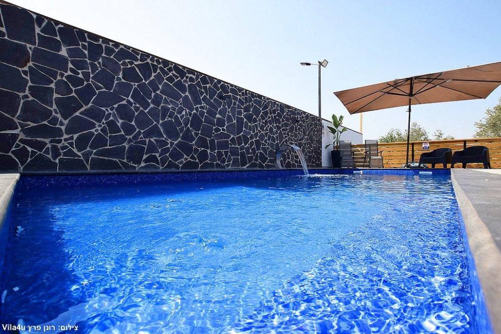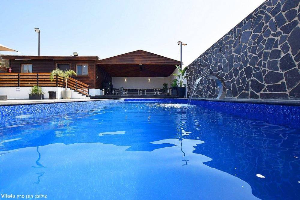 - בריכת שחיה גדולה בנויה, צלולה מרעננת עם מפל מים