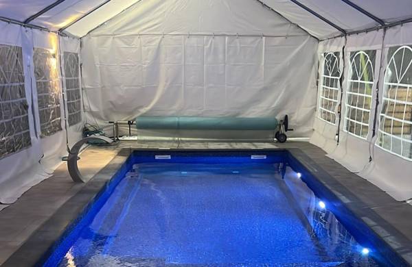 - בריכת שחיה גדולה בנויה, צלולה מרעננת עם מפל מים