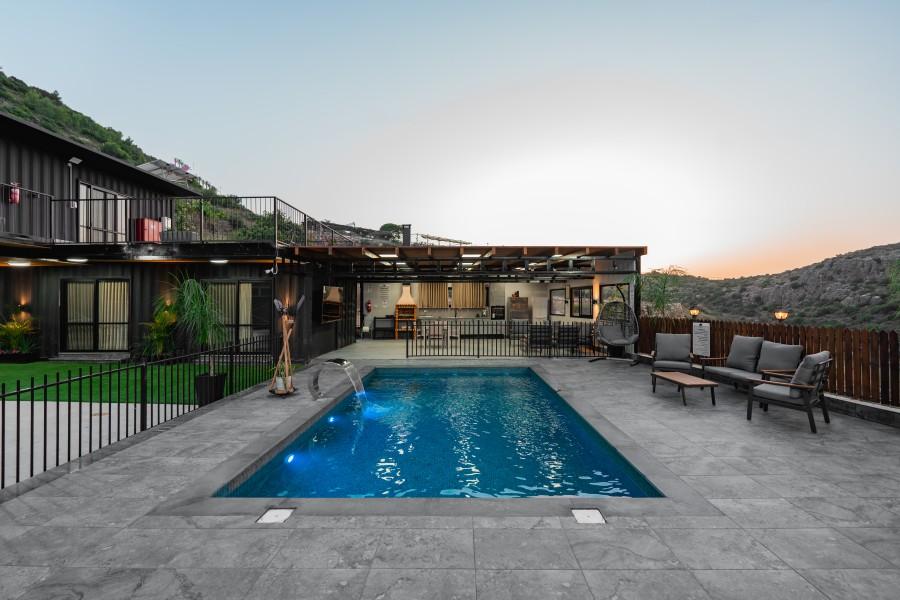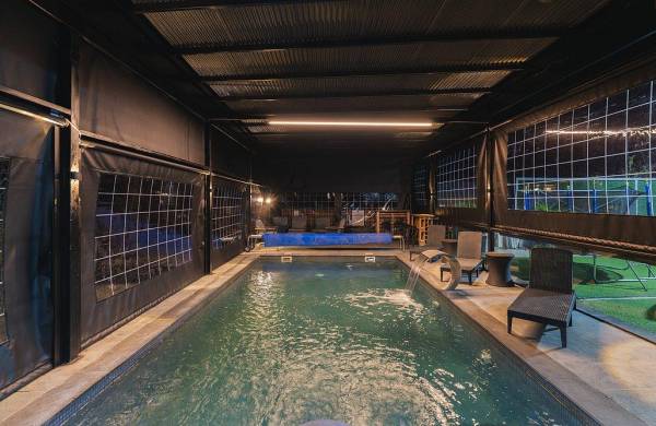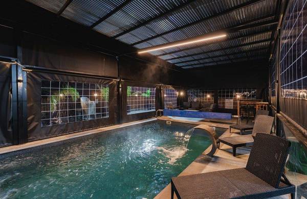 בריכת שחייה מחוממת ומקורה בגודל 8X4 עם מפל מים
