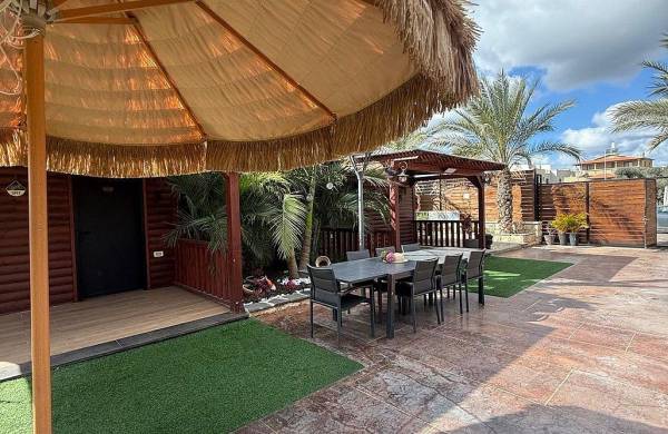 חצר גדולה עם מתחם דק ובריכת שחייה