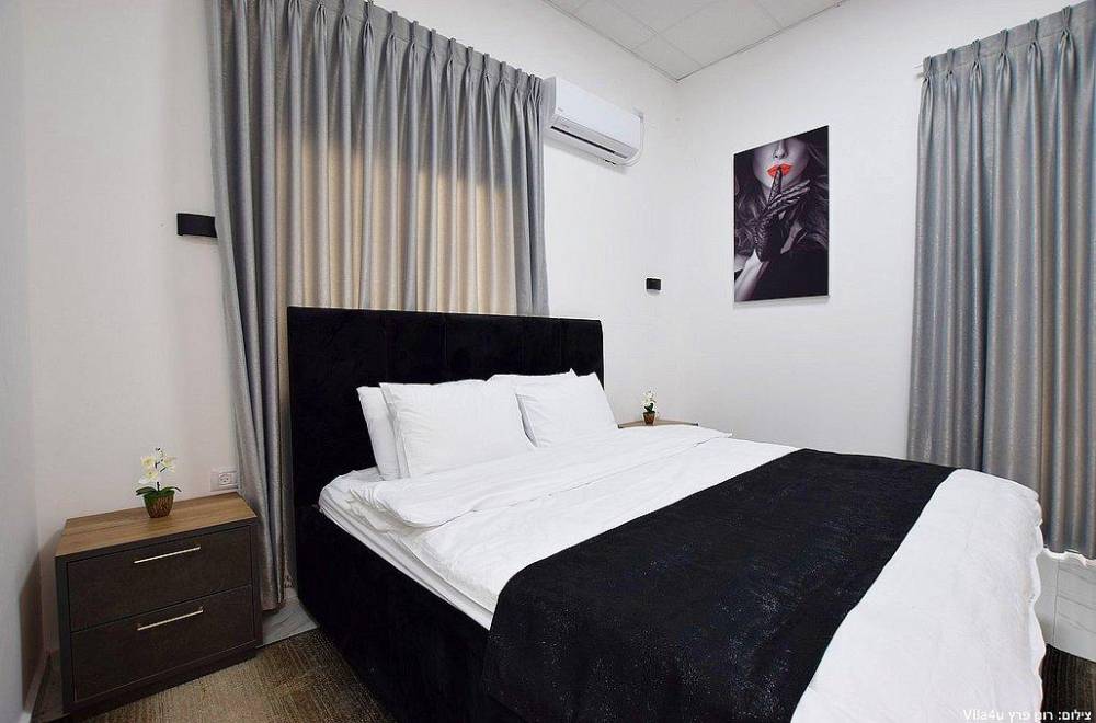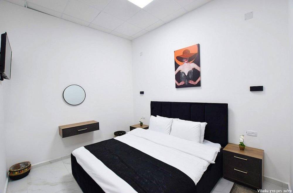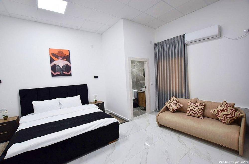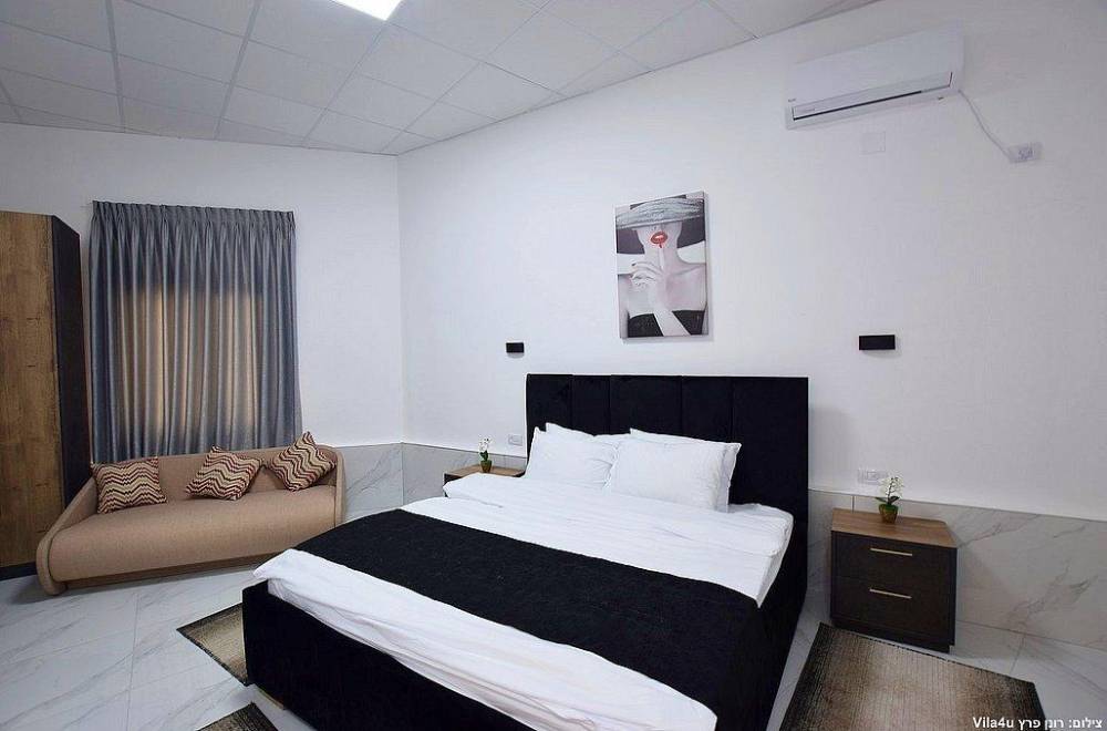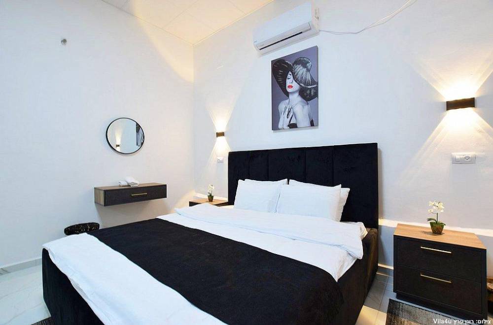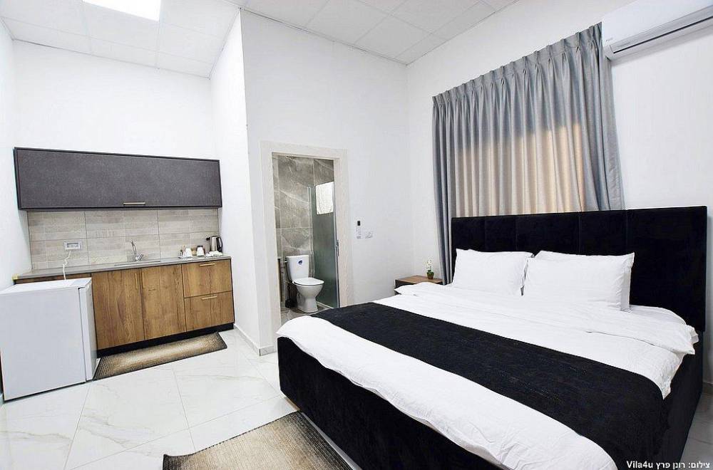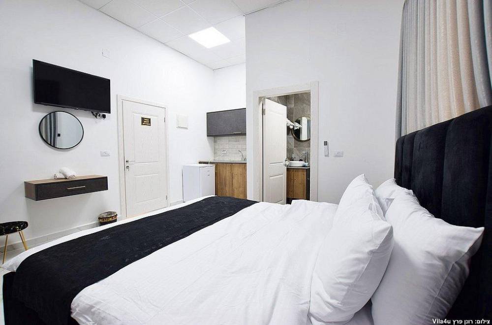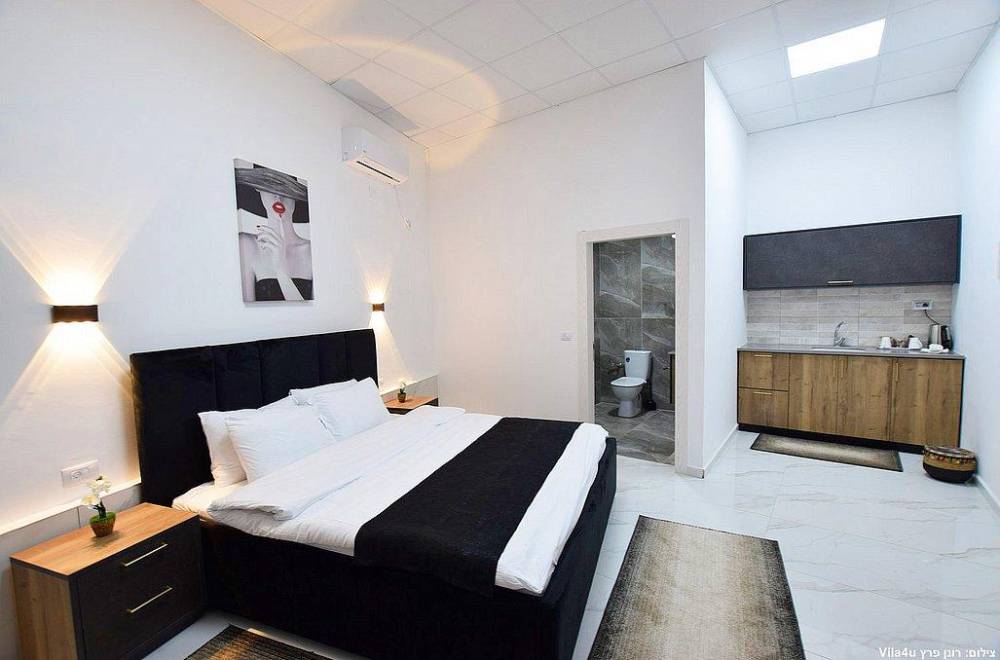 מיטה זוגית, מיזוג אוויר, טלוויזיה, שידות וארונות אחסון, שידות איפור וחדר רחצה פרטי