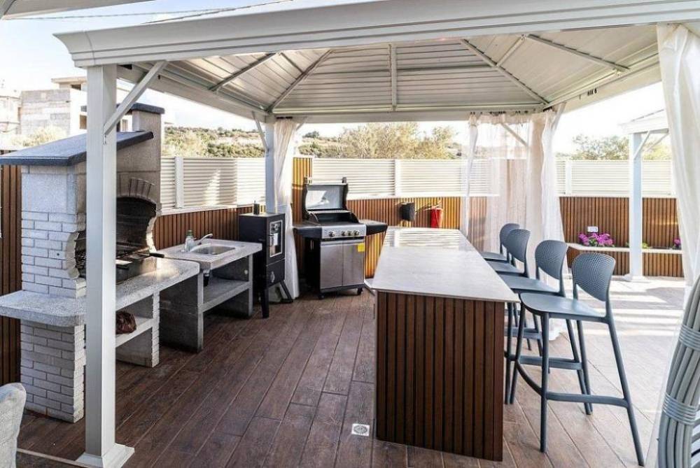 - מטבח חיצוני מקורה הכולל משטח עבודה, תנור, מקרר וכיור