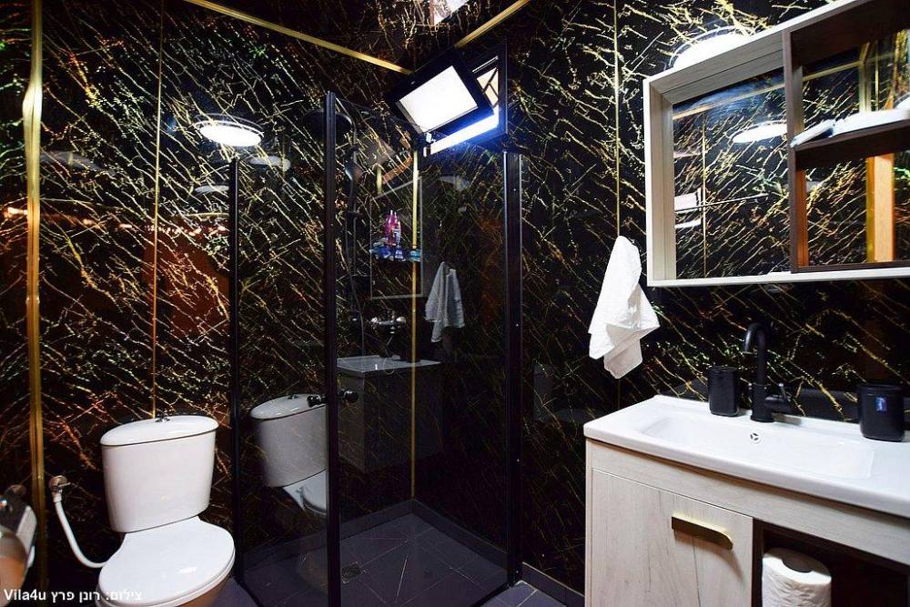 חדר רחצה עם מקלחת ושירותים לכל בקתה