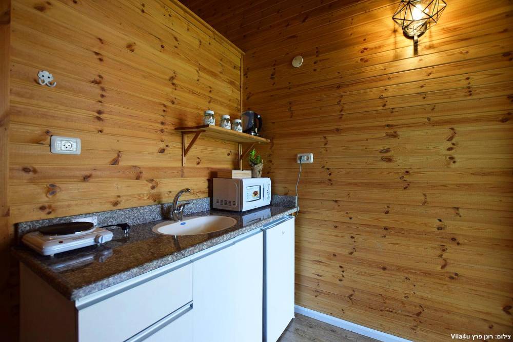 מטבחון מאובזר הכולל: קומקום, מיקרוגל, מקרר וכיריים חשמליות.