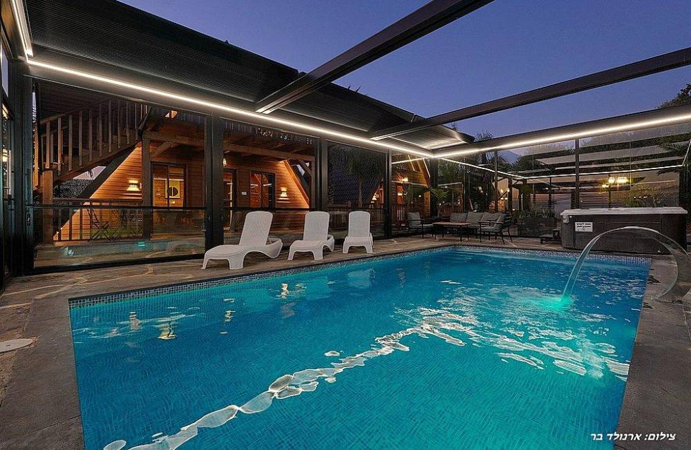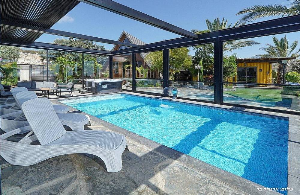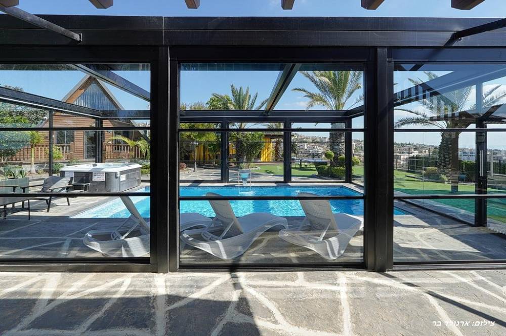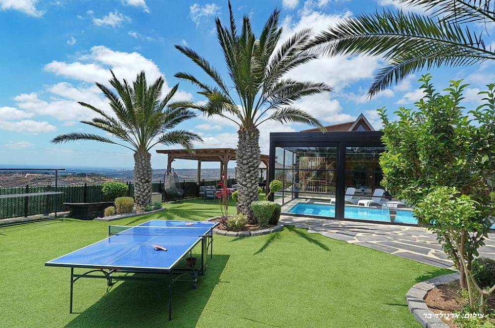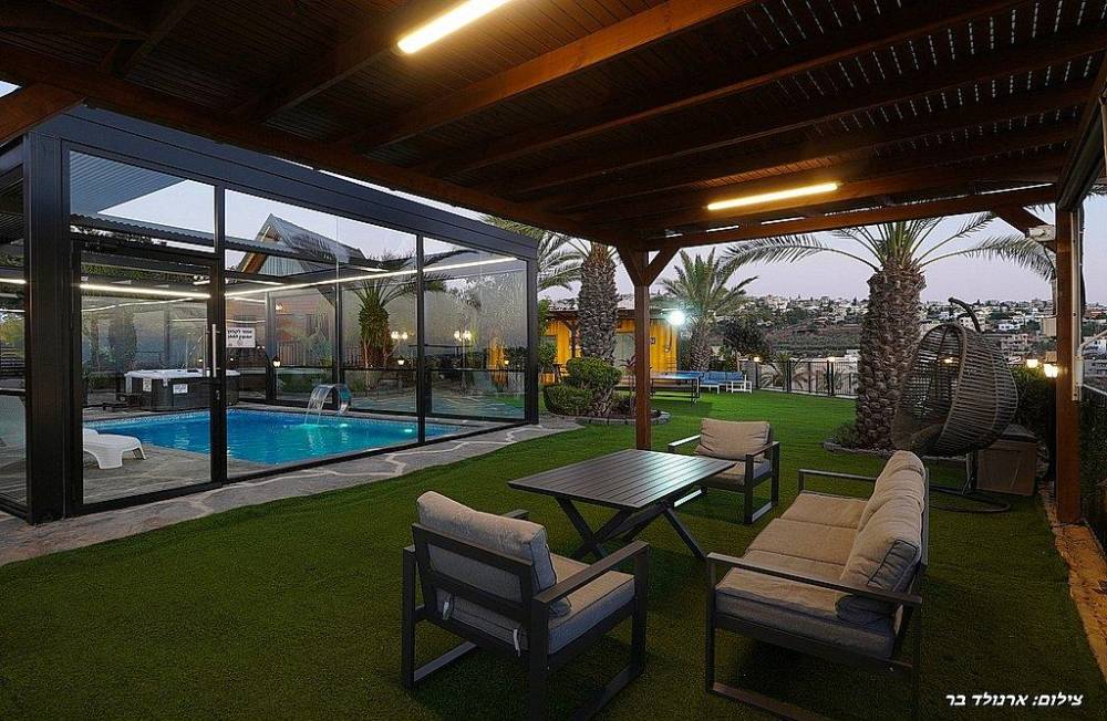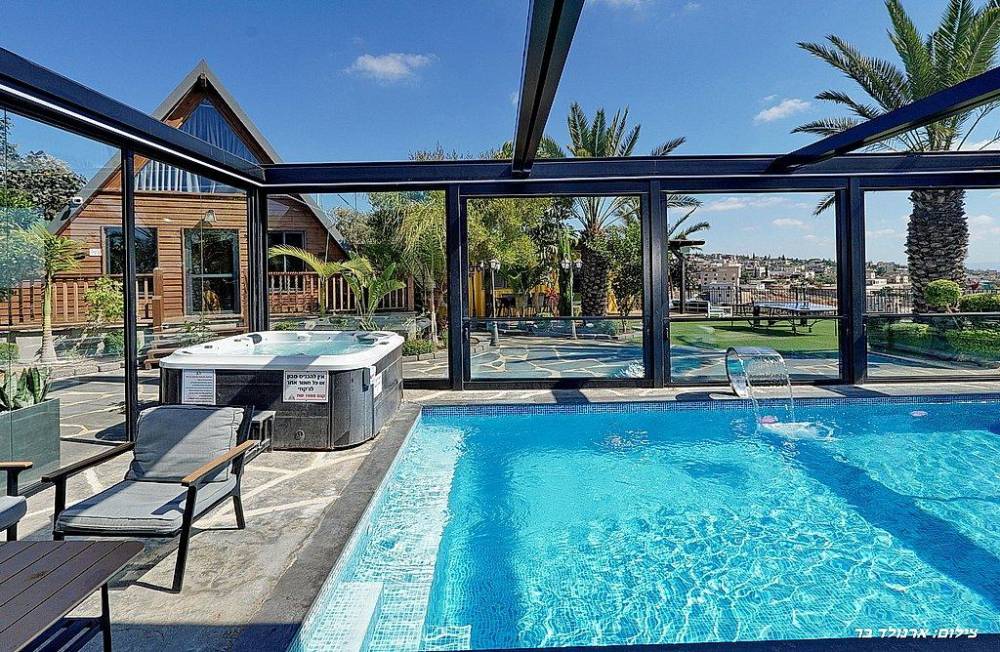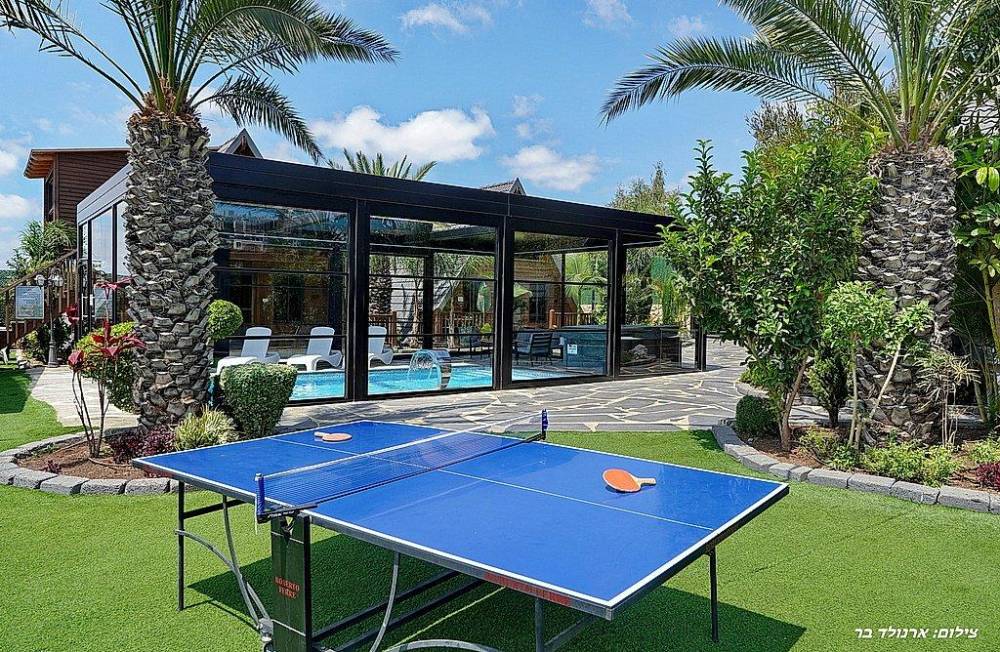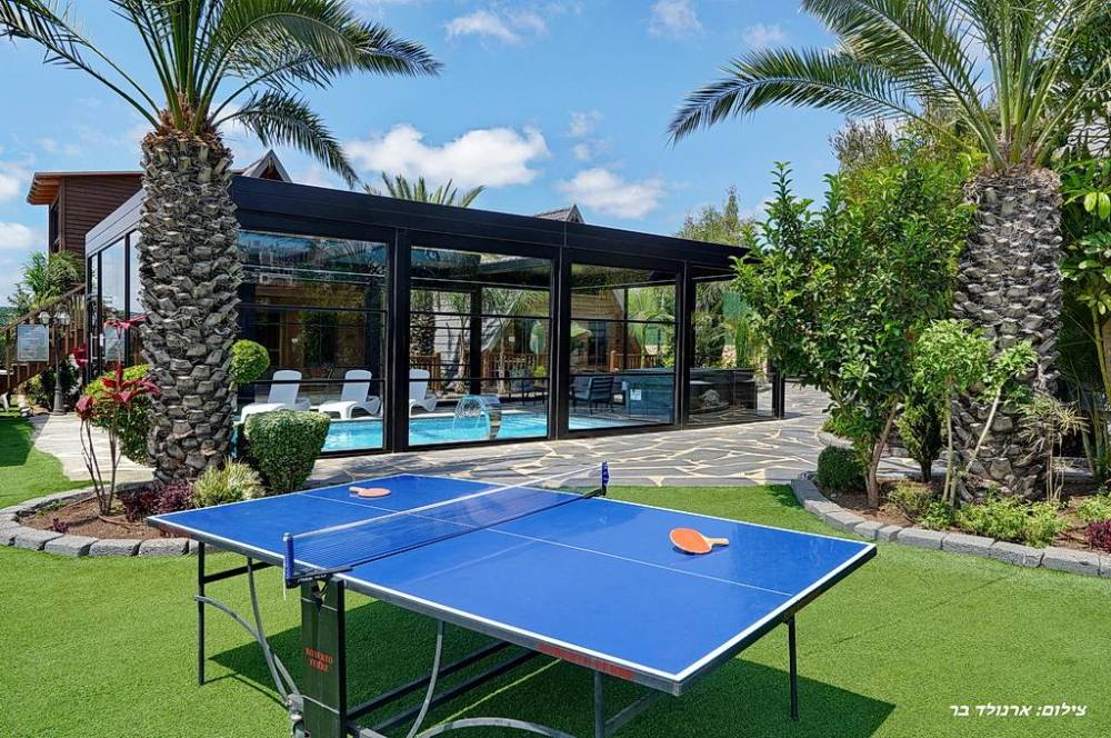 במתחם החיצוני תוכלו להנות מבריכת שחייה מחוממת ומקורה, שולחן פינג פונג ואף גם טרמפולינה לילדים.