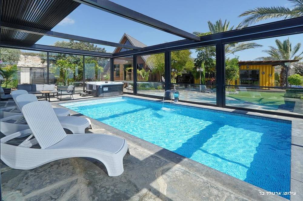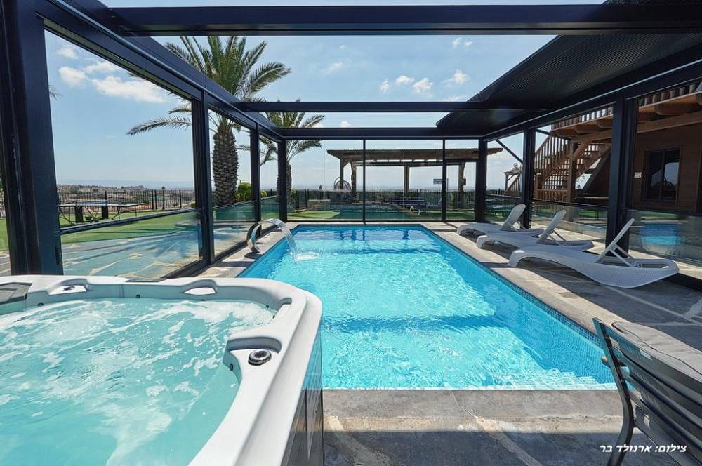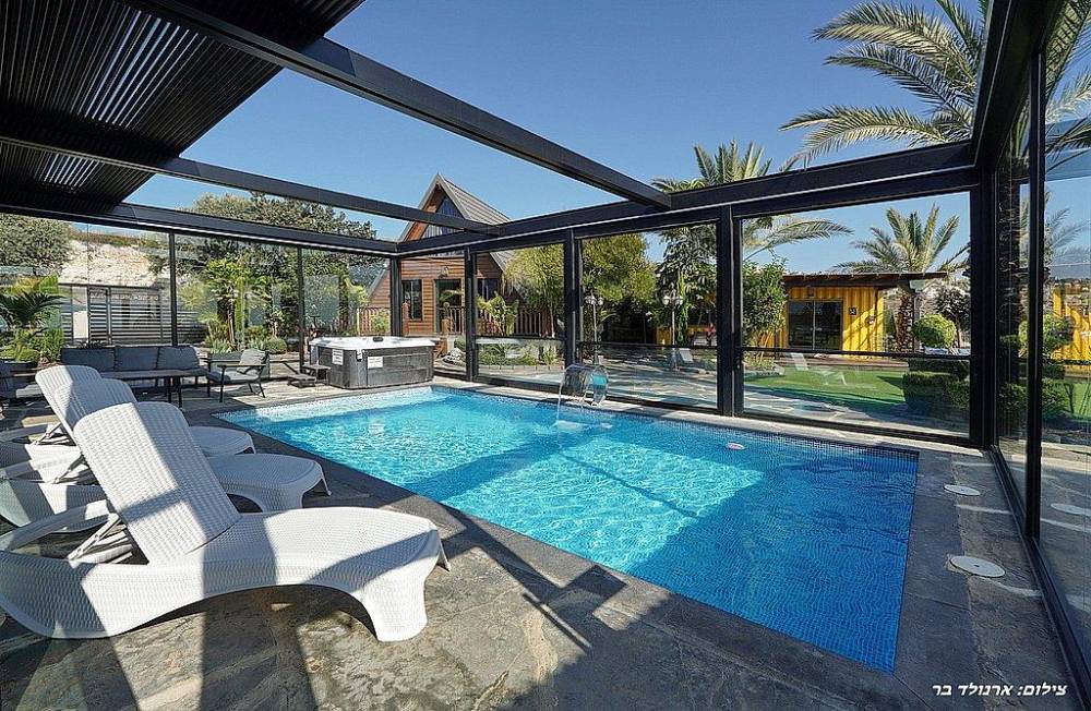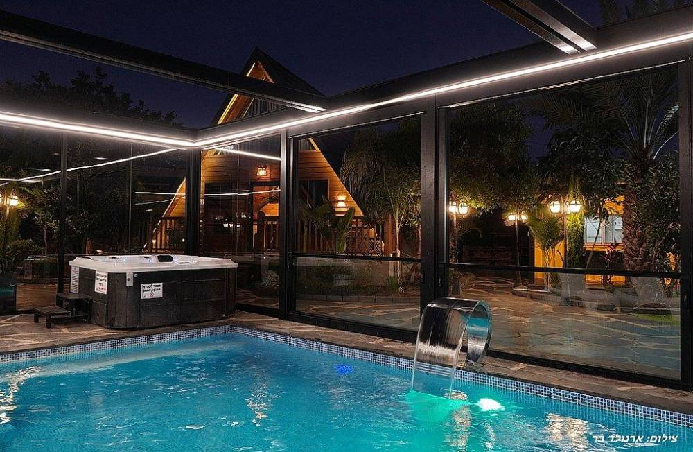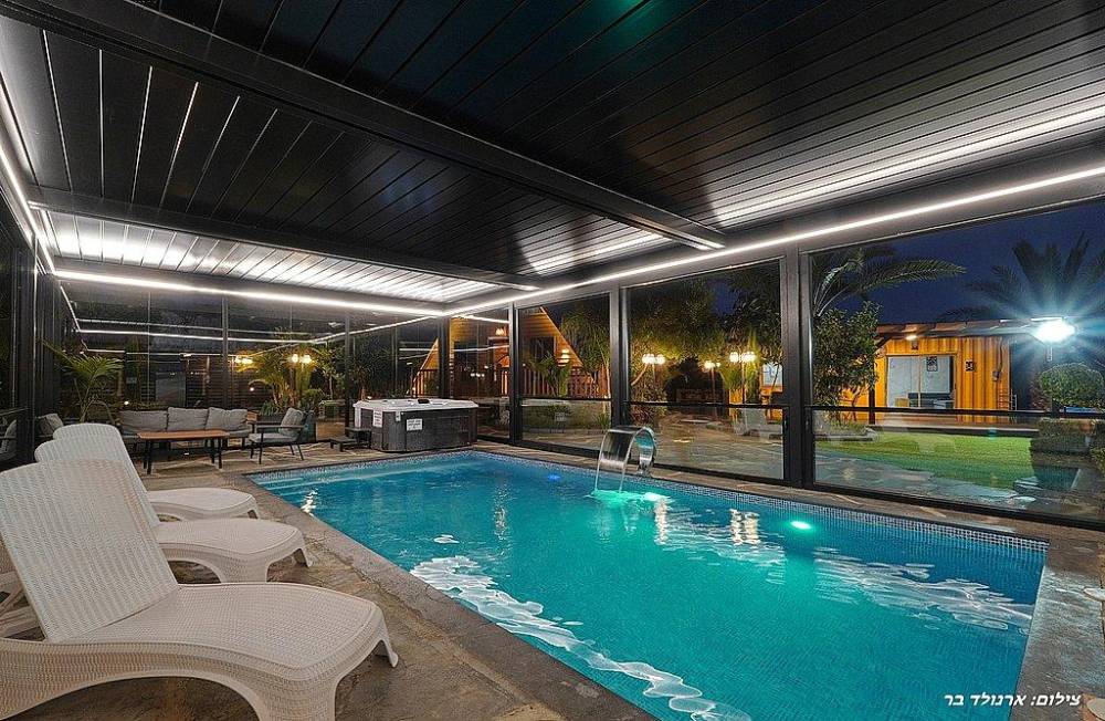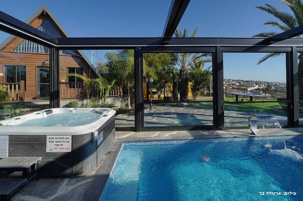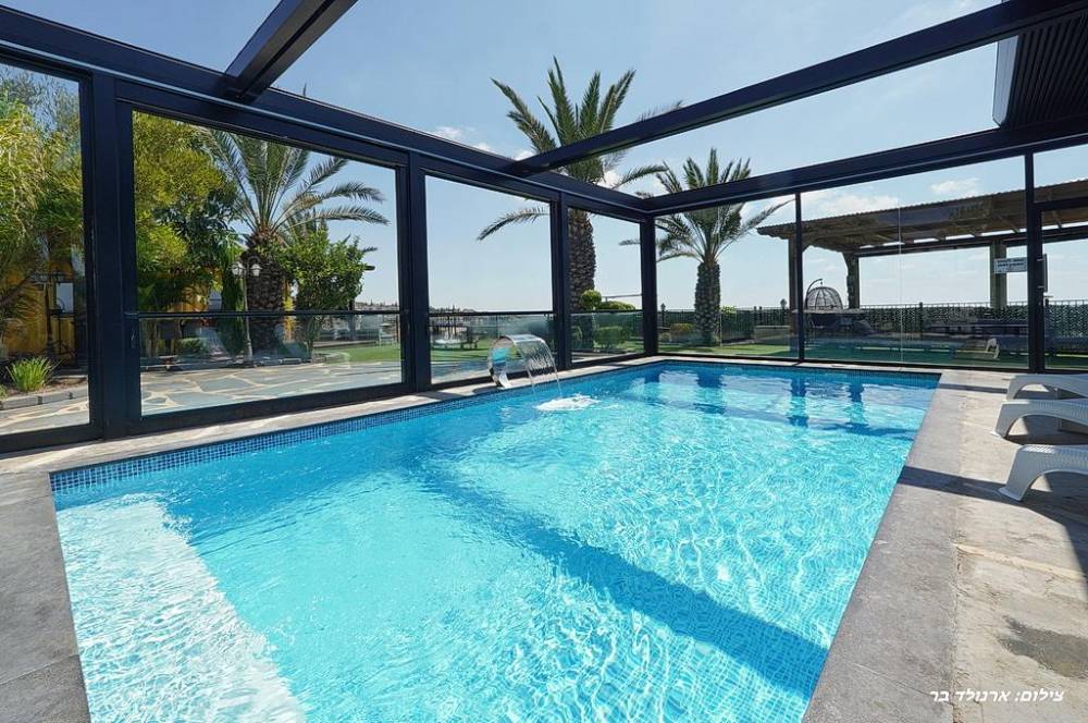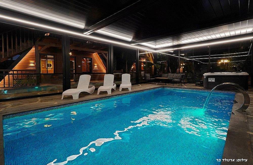במתחם החיצוני תוכלו להנות מבריכת שחייה מחוממת ומקורה, שולחן פינג פונג ואף גם טרמפולינה לילדים.