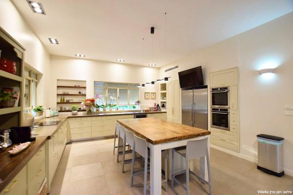 מטבח הוילה גדול ומאובזר הכולל: מקרר ענק ומקפיא, 2 תנורים, מכונת קפה מדגם נספרסו, כיריים אינדוקציה, תמי 4, כלי אוכל והגשה ומסך טלוויזיה
