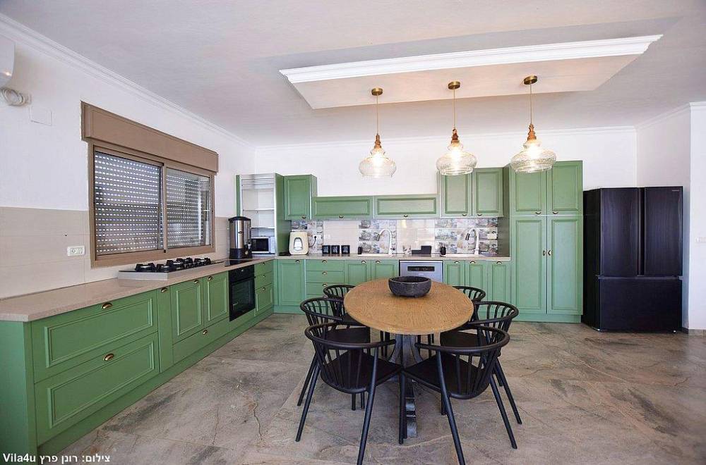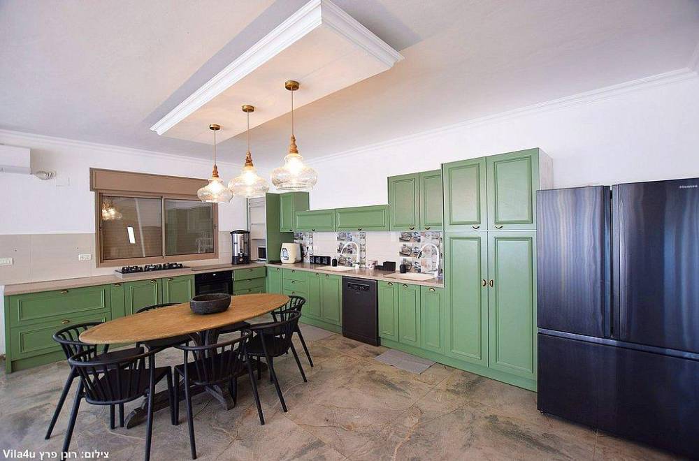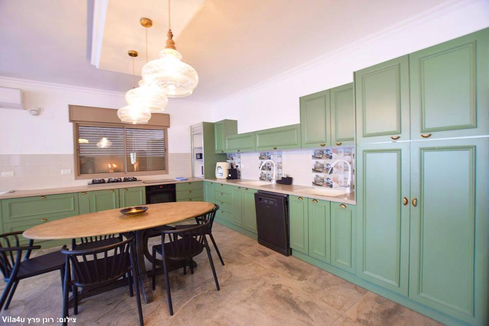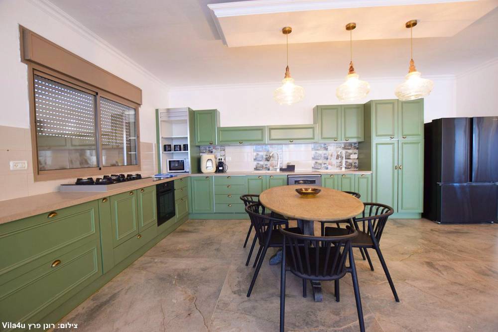 מטבח מאובזר וגדול הכולל מקרר, 2 כיורים, מדיח כלים, תמי4, מיחם, כיריים גז, תנור אפיה, כלי אוכל והגשה.
