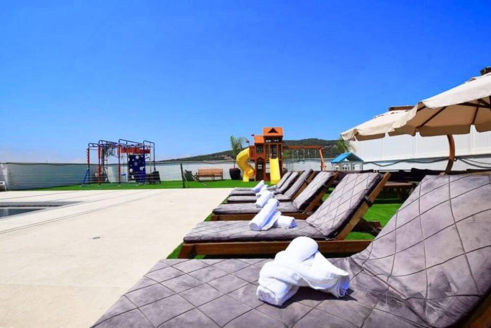 מיטות שיזוף וכסאות לצד הבריכה
