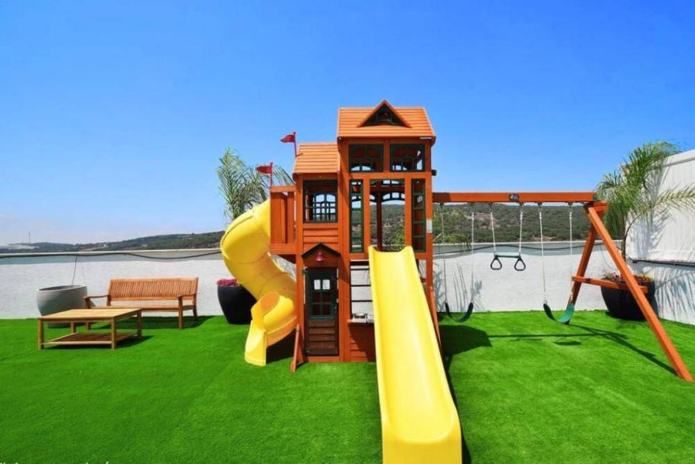 מתחם משחקים לילדים הכולל - בית משחקים, מגלשות, מתקן נינג'ה, נדנדות ועוד.