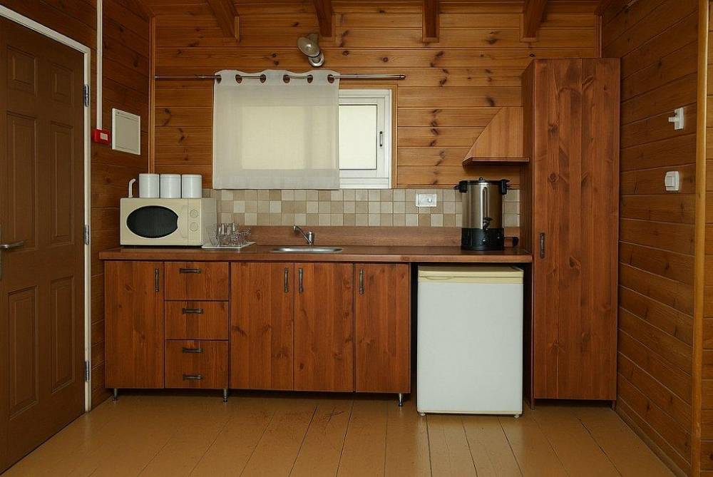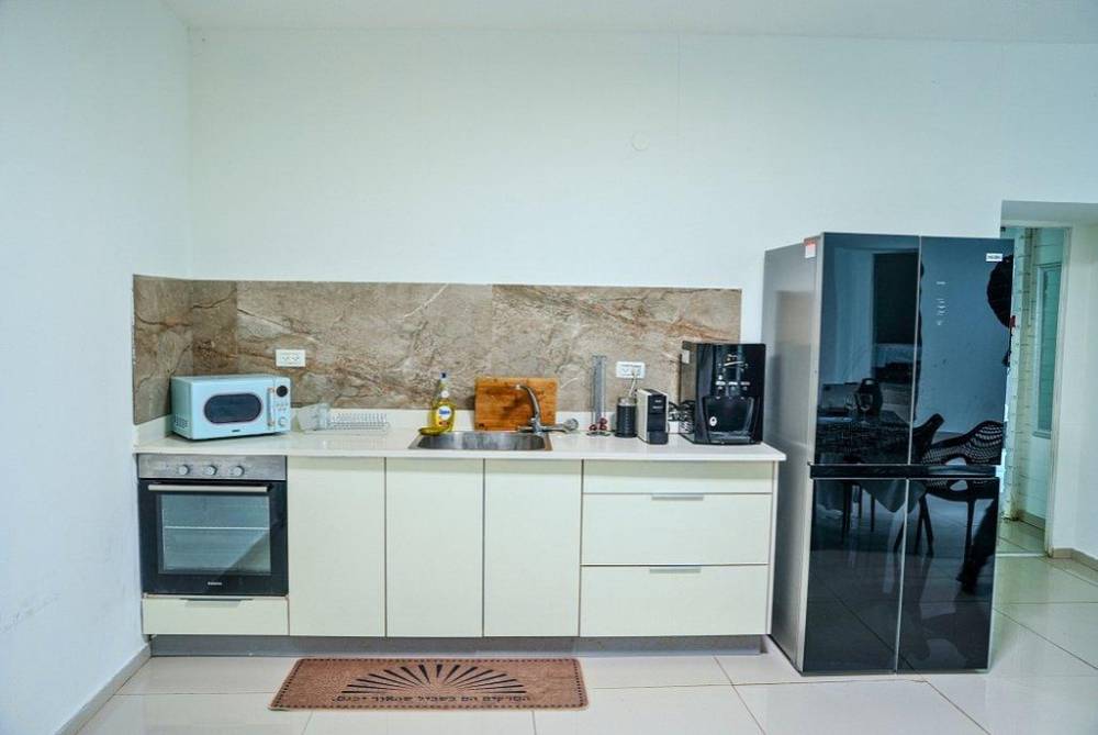 מטבח מאובזר הכולל: מקרר, מיקרוגל, טוסטר אובן, כיריים חשמליות, מתקן מים תמי 4, כלי בישול והגשה
