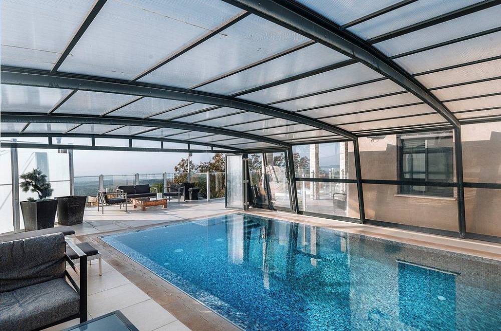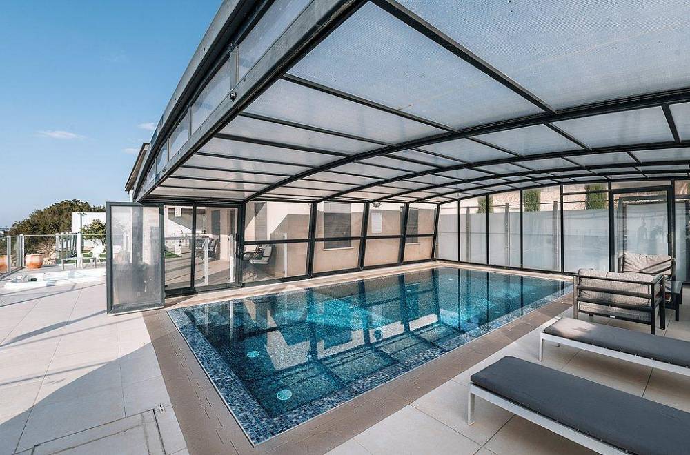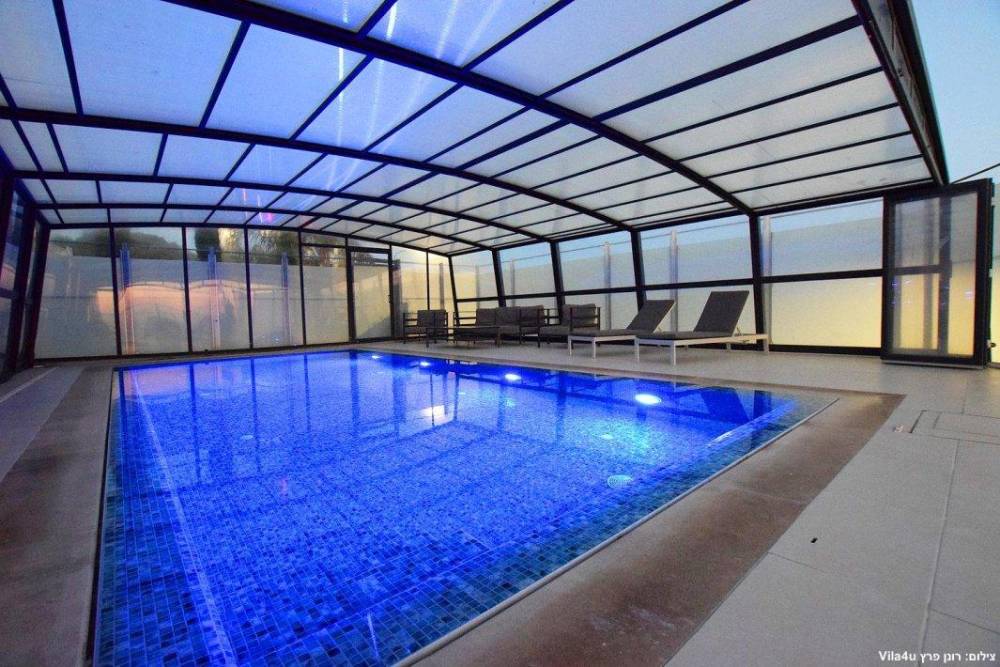 בריכת שחייה גדולה, מחוממת ומקורה, הבריכה בטיחותית, גודל הבריכה מידות: 10×5 מטר, עומק מקסימלי: 1.4 מטר