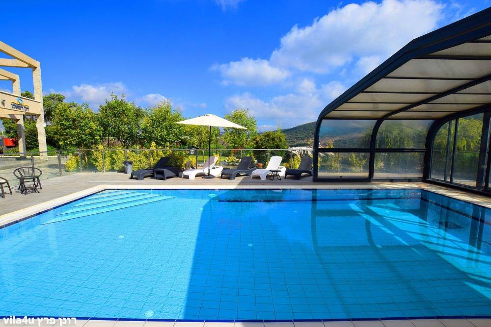בריכת שחייה מחוממת ומקורה עם מדרגות ותעלות גלישה. גודלה 6 על 12 מטר, עומק 1.80 ומוארת בתאורת לד מתחלפת