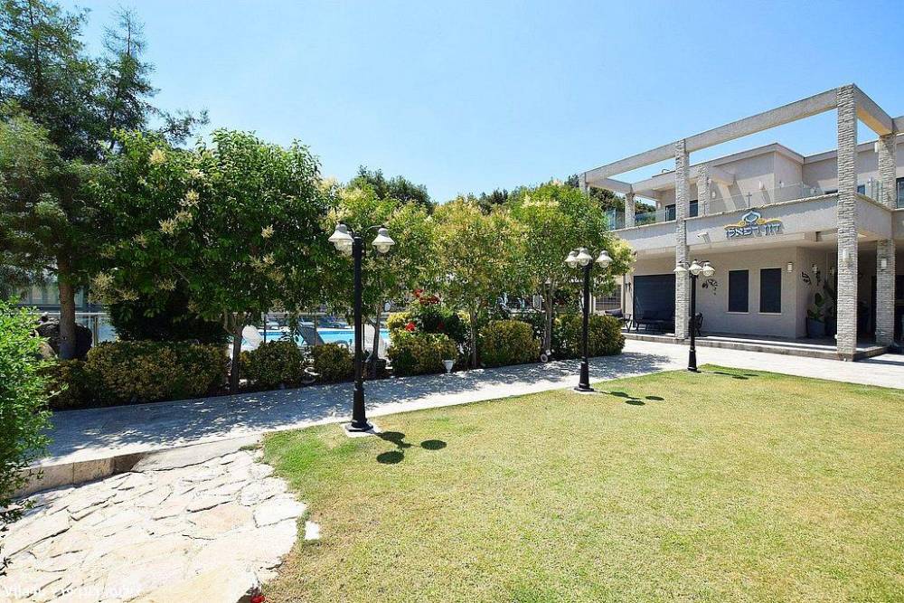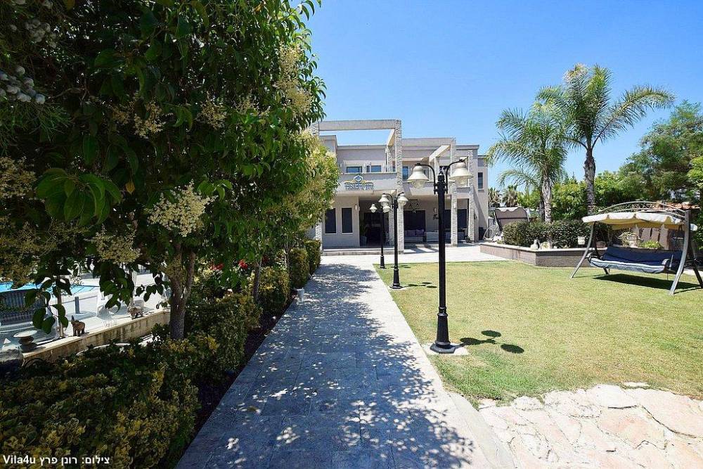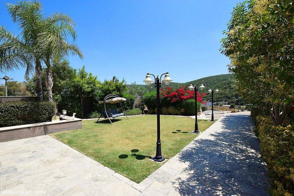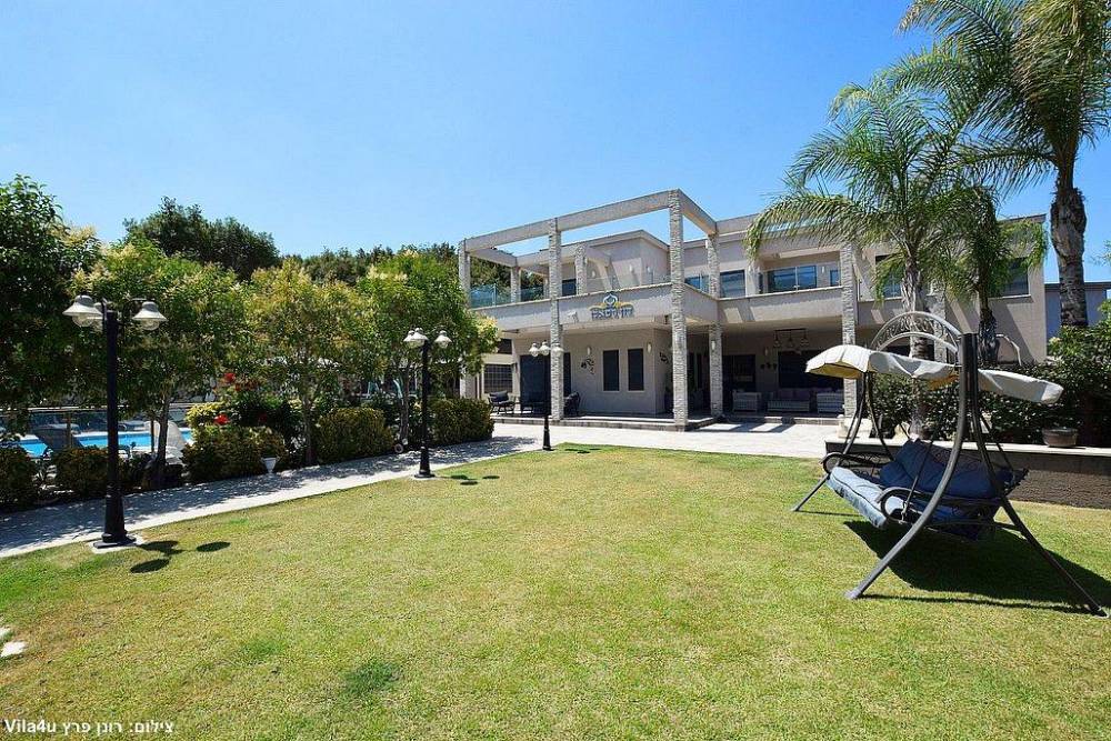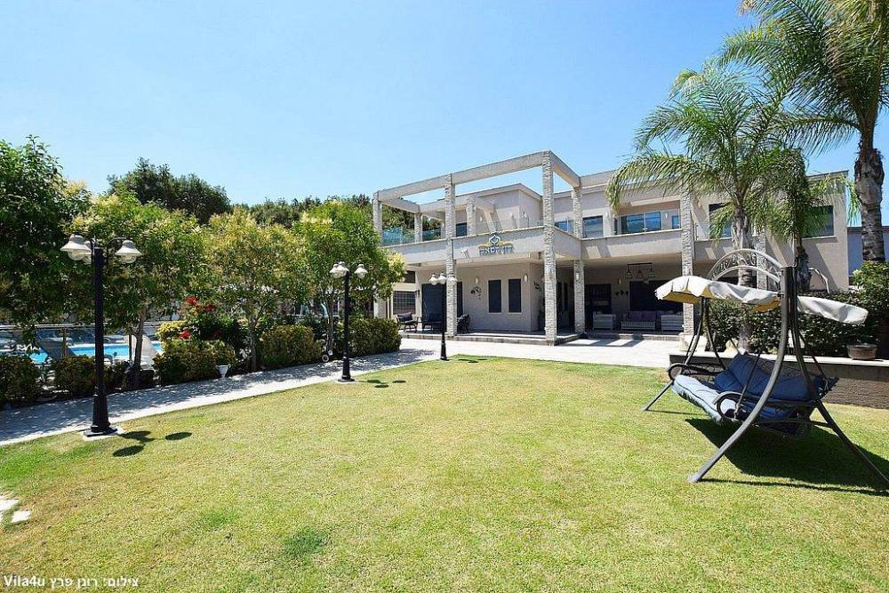 חצר ענקית עם מדשאות ירוקות, פינות ישיבה ומיטות שיזוף