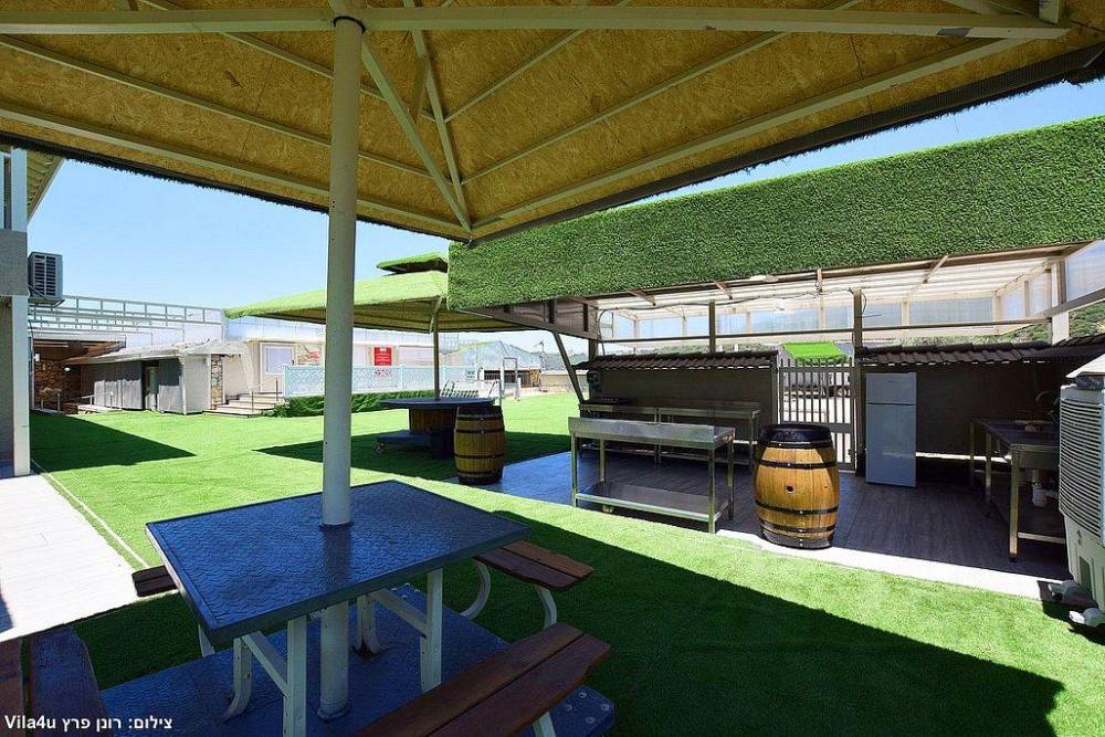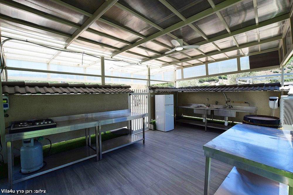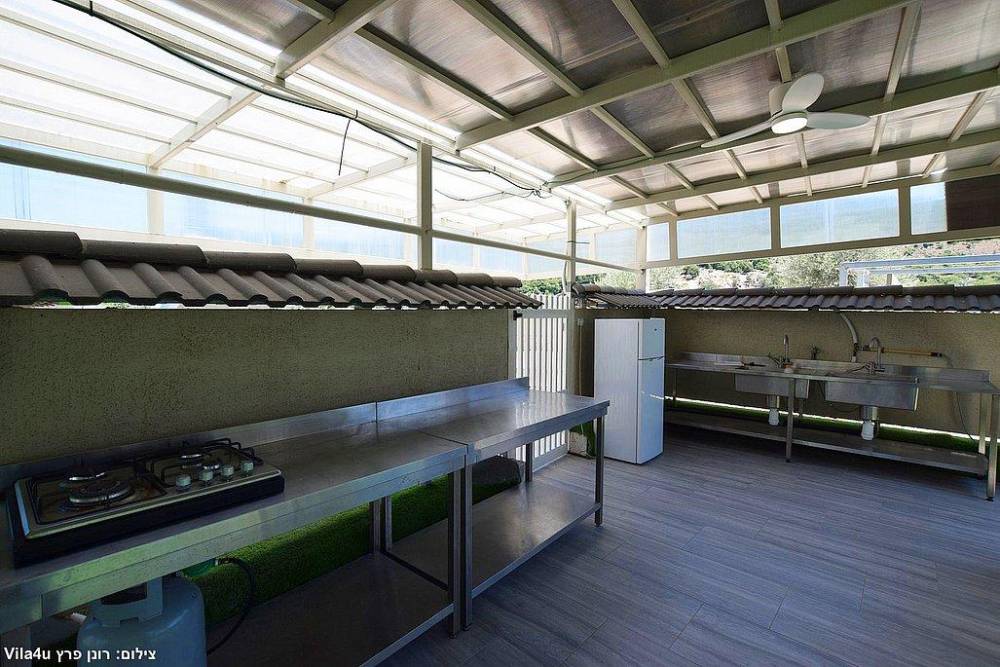 - מתחם מקורה נוסף הכולל מטבח חוץ ובו: מקרר, מקפיא, 2 כיורים , כיריים גז, ומשטח עבודה