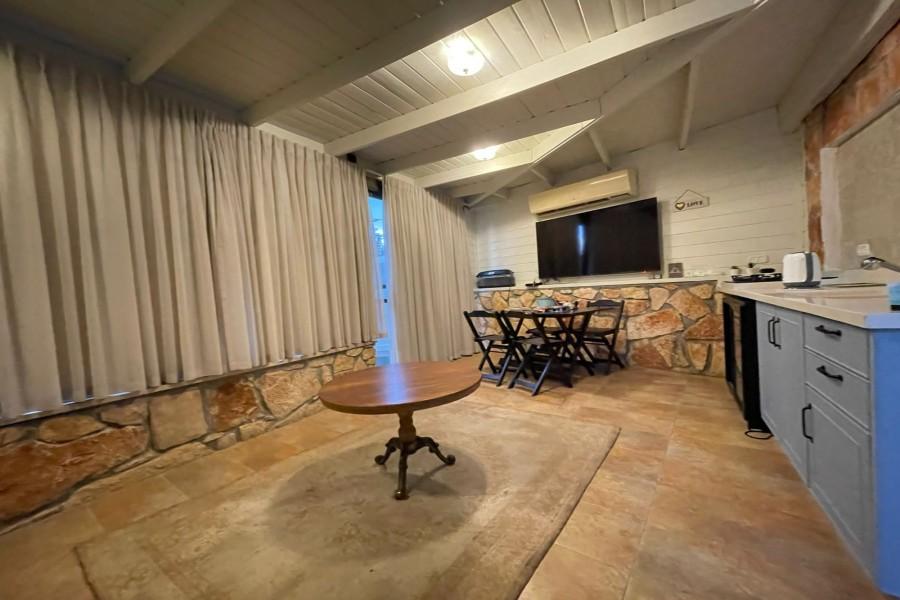 סלון מרווח הכולל מיטה נפתחת, טלוויזיה, פינת אוכל, מיזוג אוויר