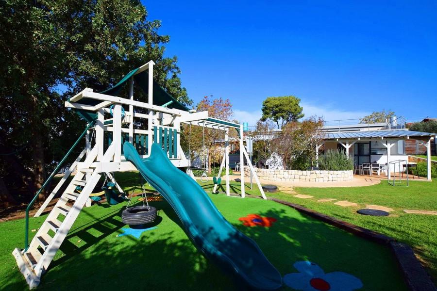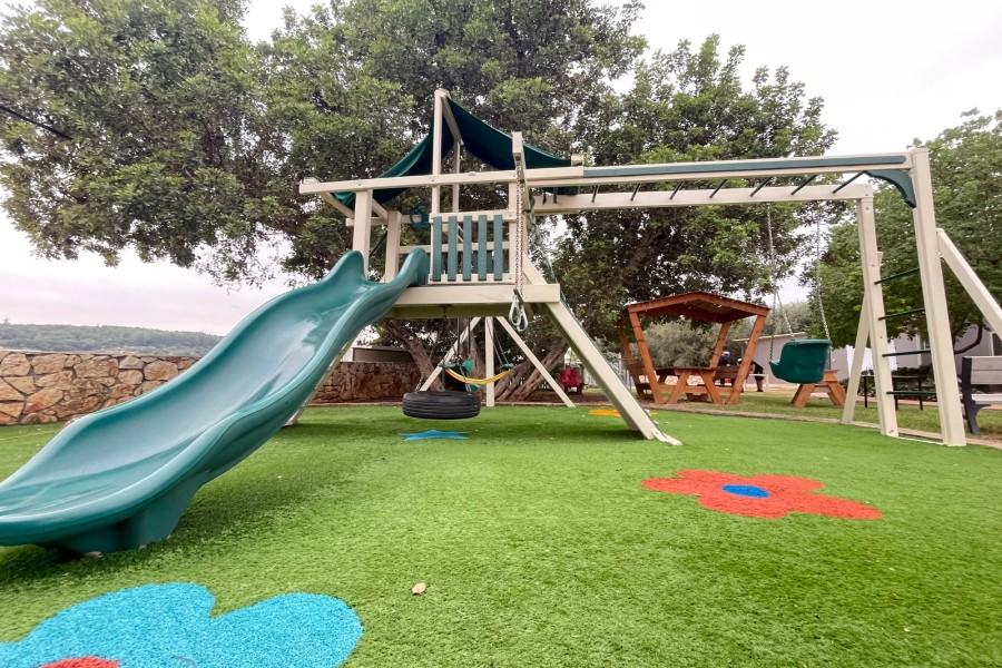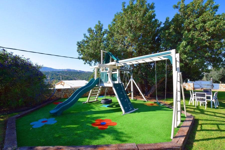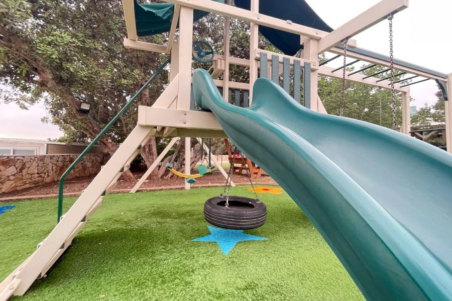 - מתקן משחקים עם נדנדות, קיר טיפוס, מגלשה