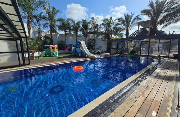 בריכה גדולה, מחוממת ומקורה עם מגלשה