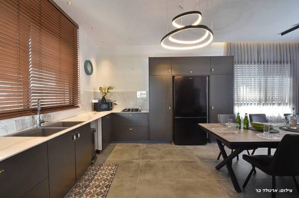 מטבח מאובזר הכולל 2 תנורים, 2 כיורים, מיקרוגל, כיריים גז, מקרר, תמי4, כלי אוכל והגשה.