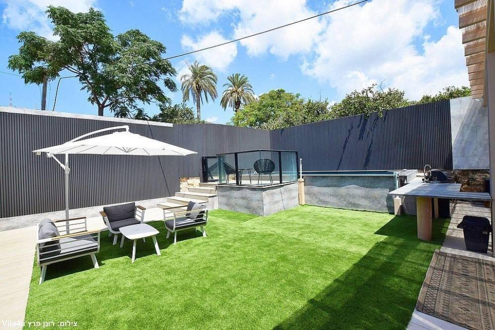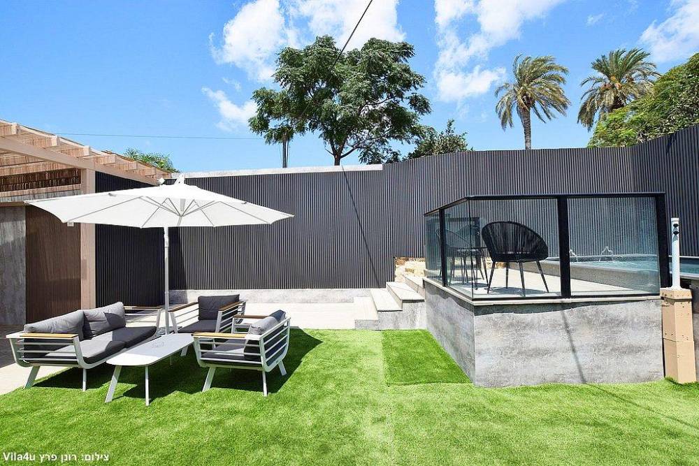חצר פרטית לסוויטה עם בריכת שחייה פרטית, מדשאה, פינות ישיבה