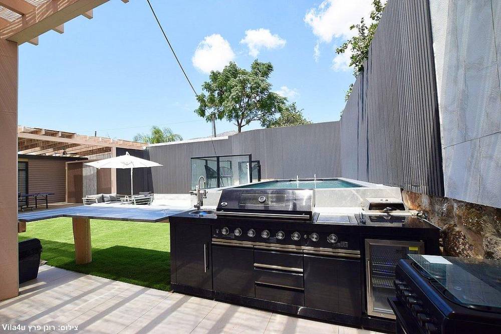 מטבח בשרי חיצוני הכולל: כיור, משטח עבודה, מקרר, תנור אפיה, מנגל גז, כיירים גז