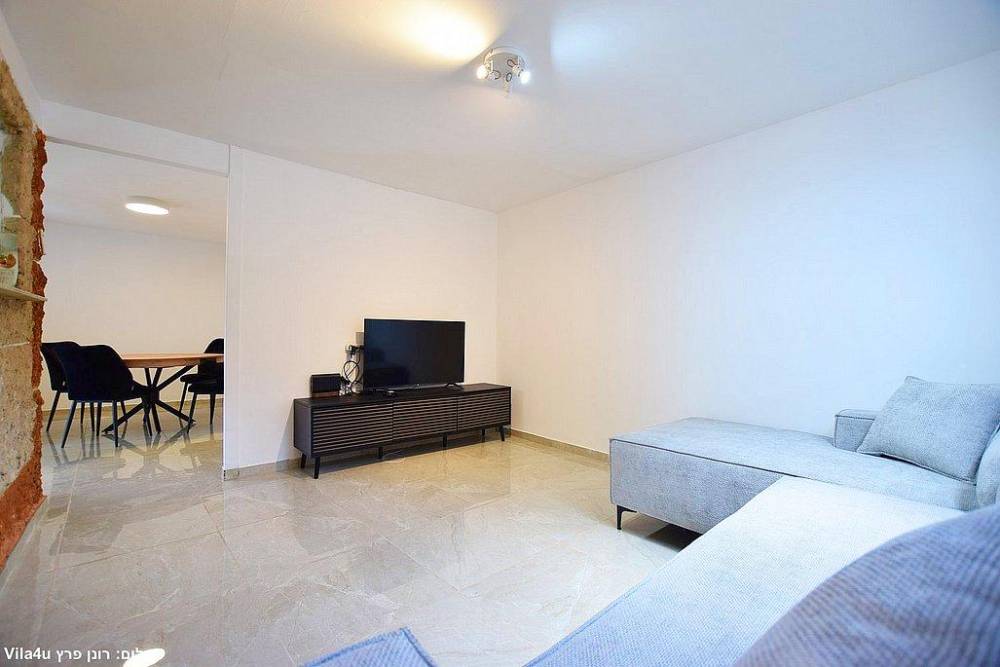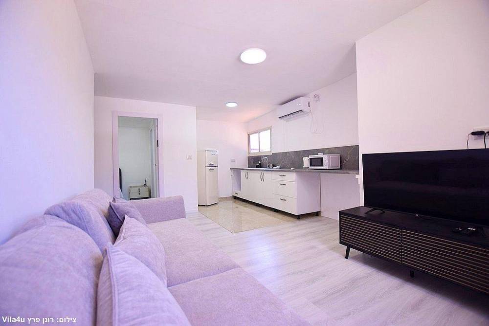 סלון עם מסך טלוויזיה, חדר שינה הכולל מיטה זוגית, מזגן ושידות