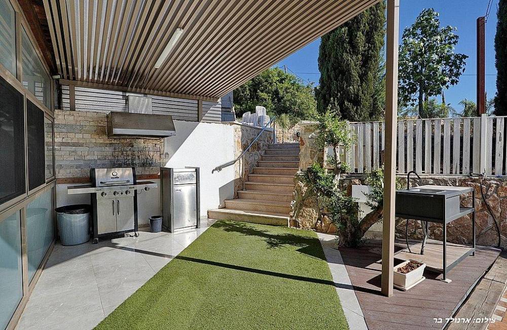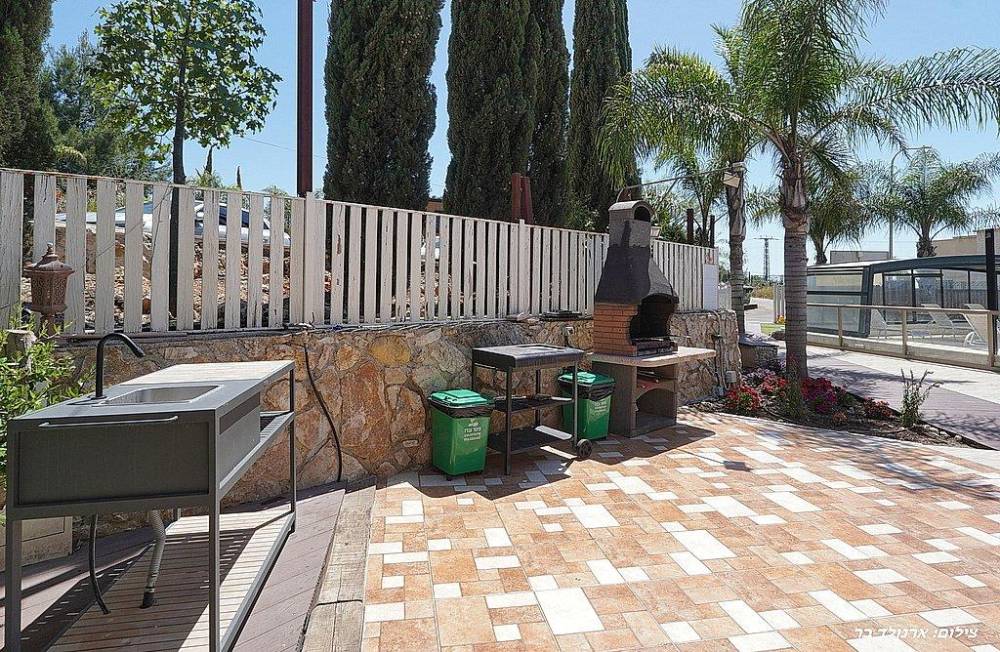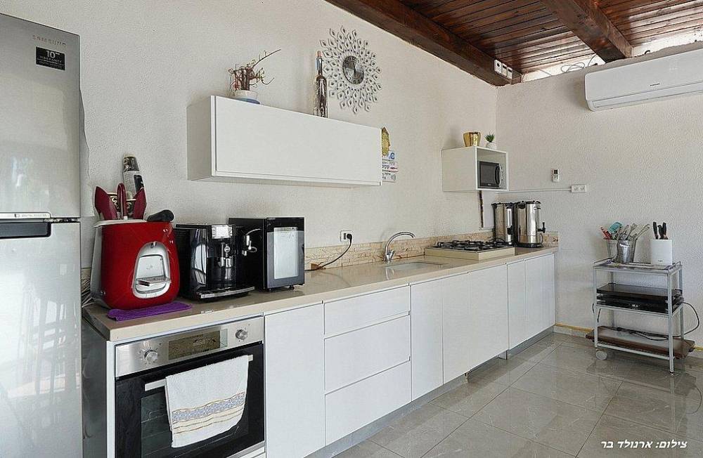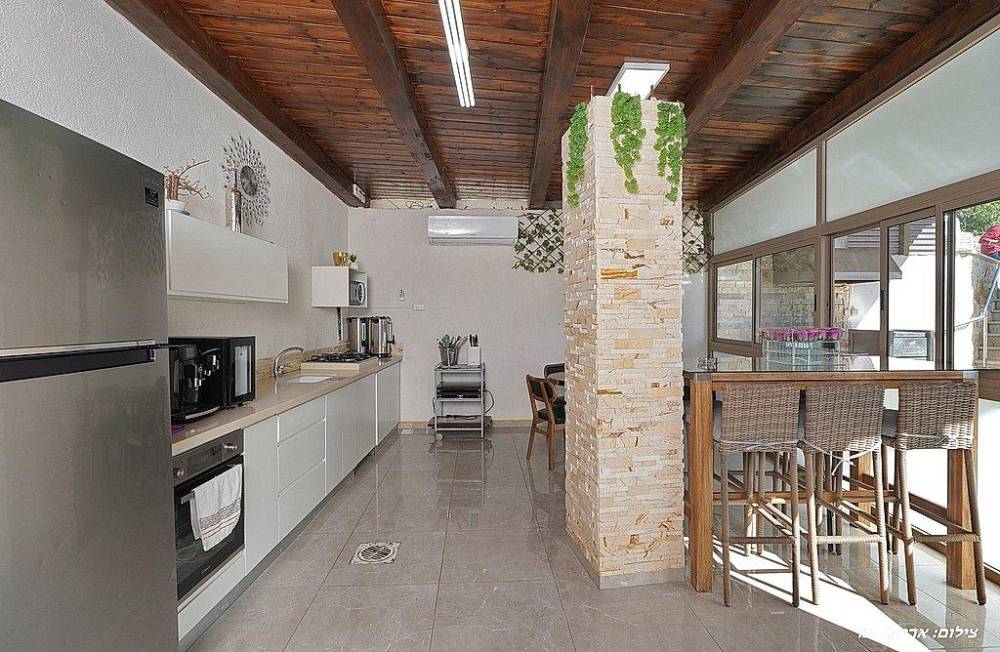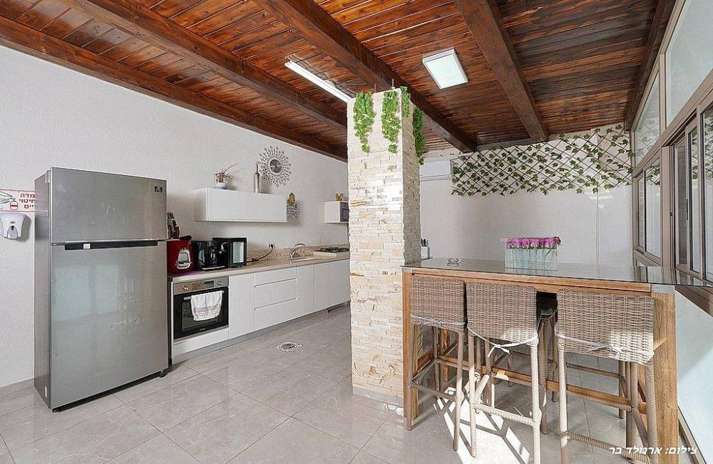 מטבח חיצוני ובו: תמי 4, מקרר, מצנם, מדיח כלים, תנור וכיריים