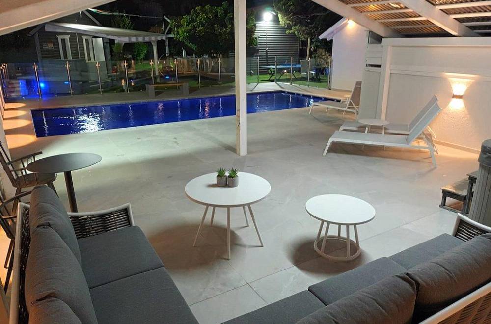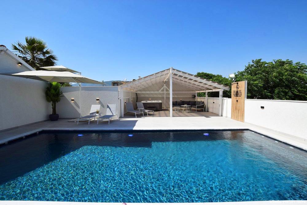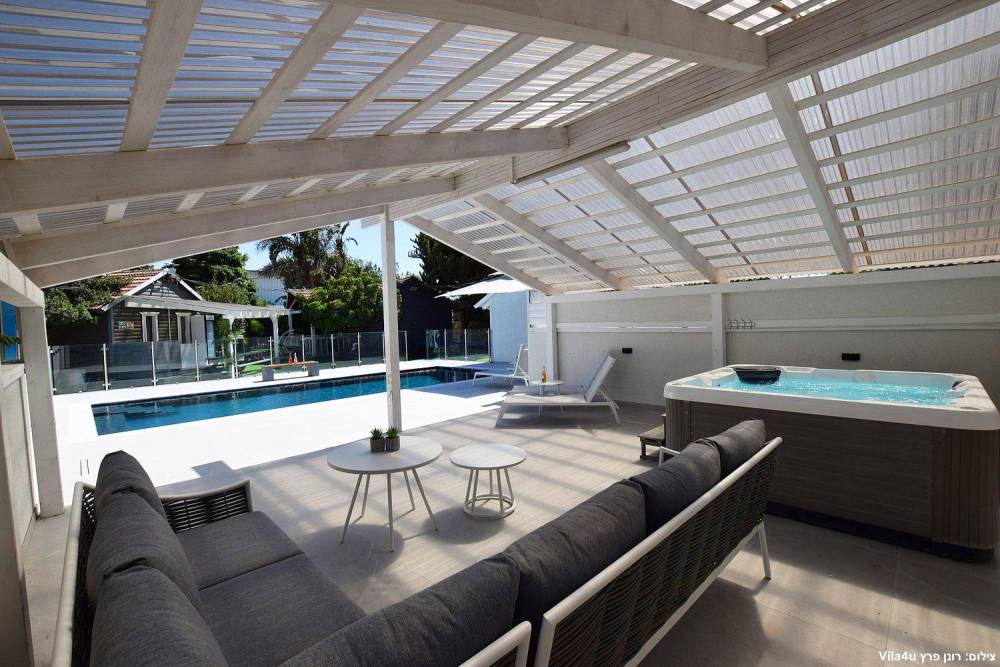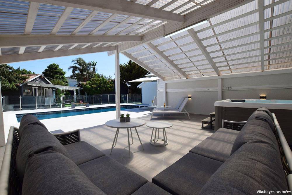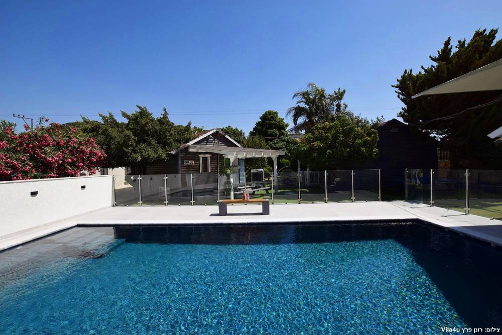 חצר גדולה עם מתחם דק ובריכת שחייה