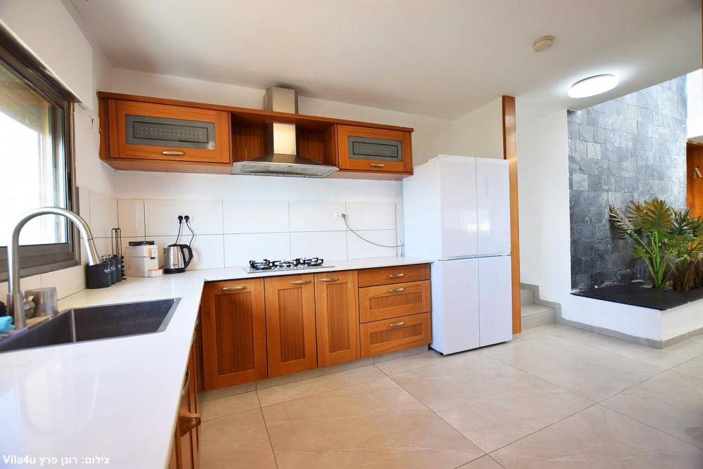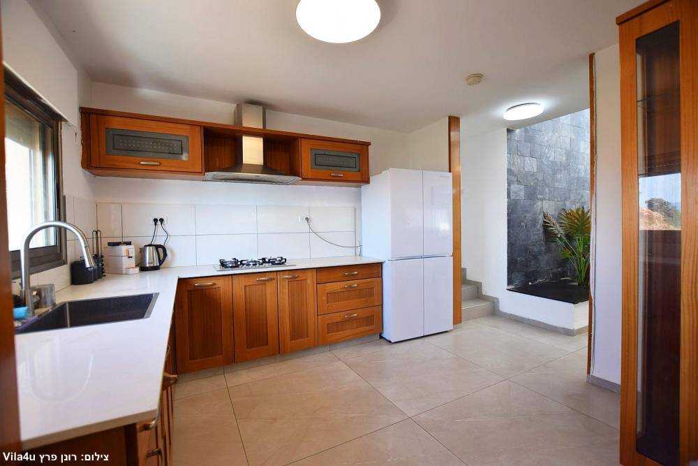 מטבח מאובזר הכולל: מקרר, תנור, כיריים גז, מכנות קפה, קומקום חשמלי