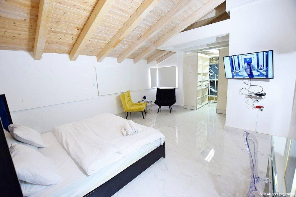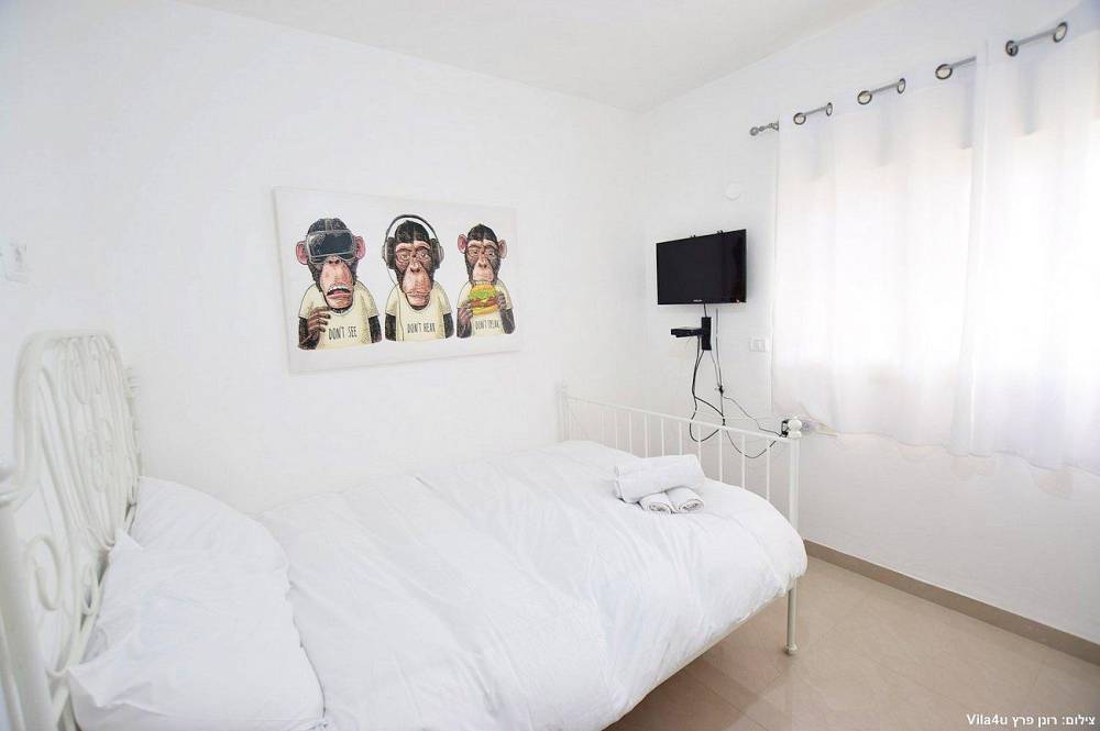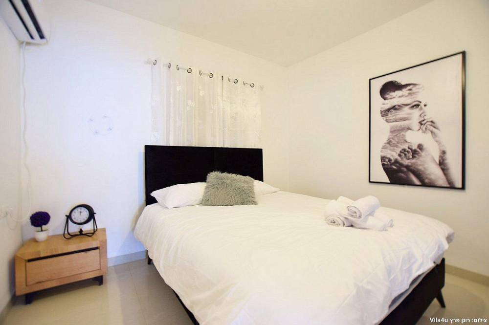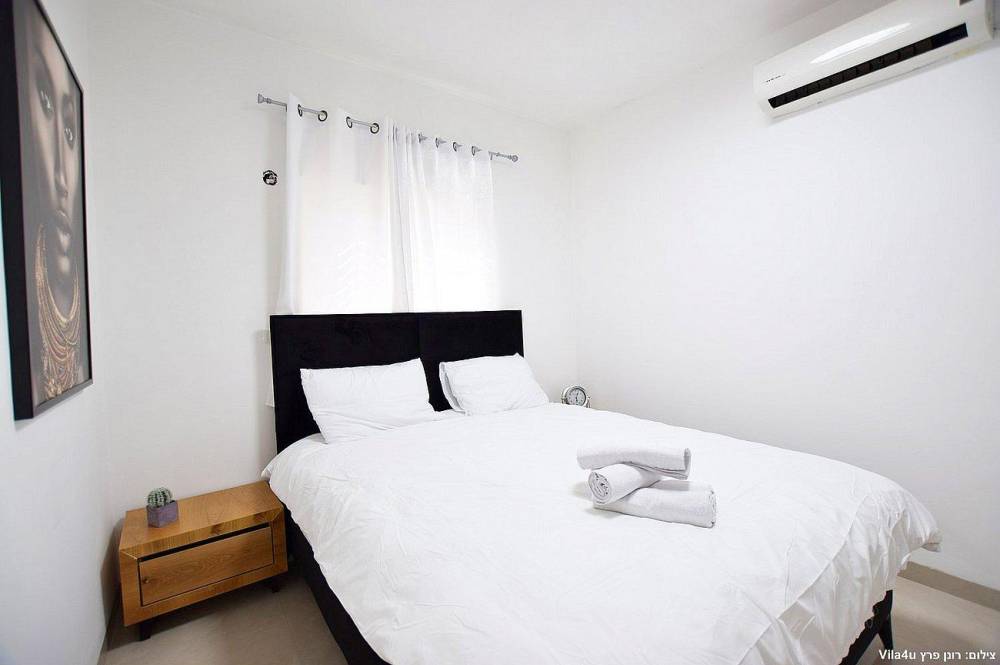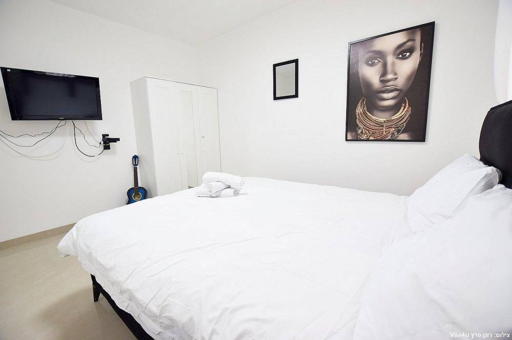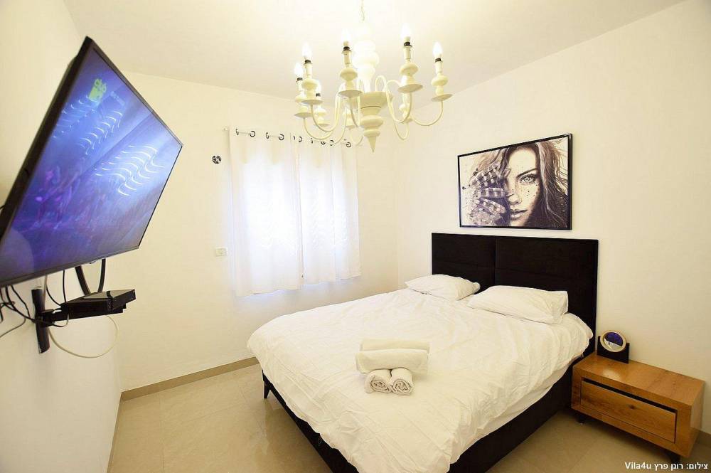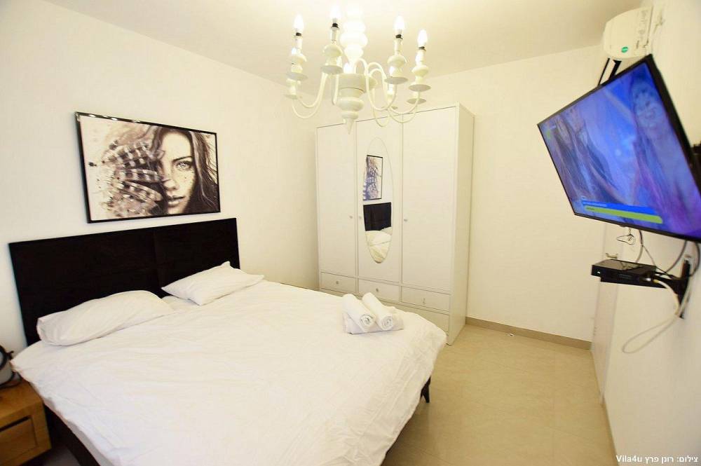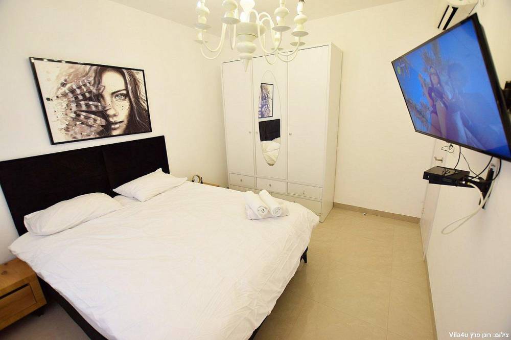 4 חדרי שינה מעוצבים בכל חדר: מיטה זוגית נוחה, טלוויזיה, מיזוג אוויר וארון לאחסון