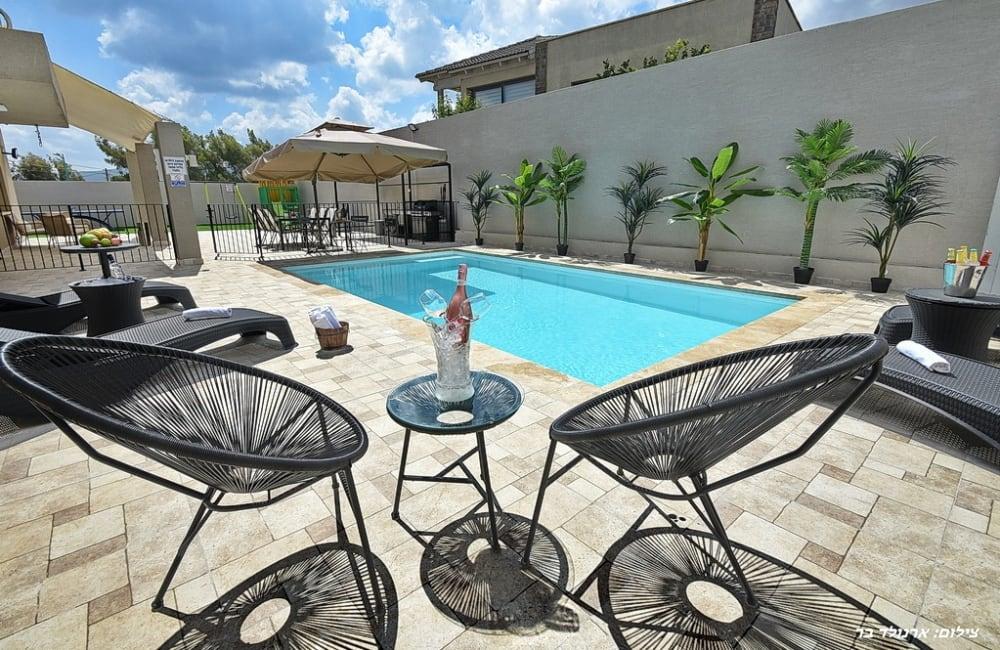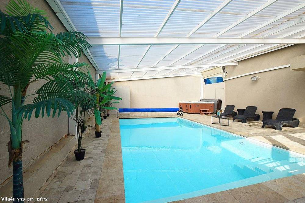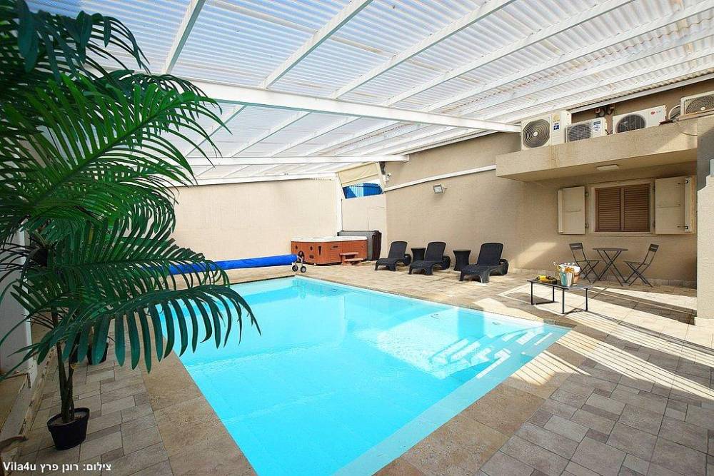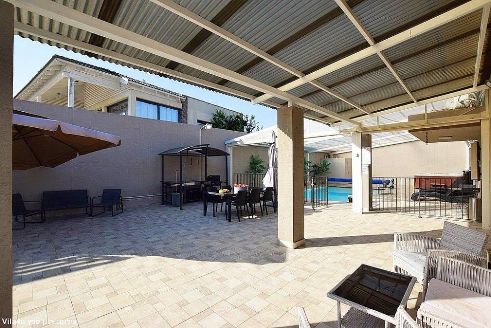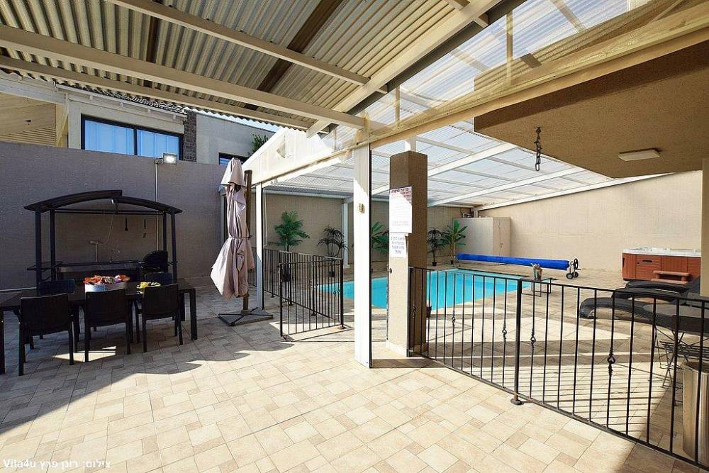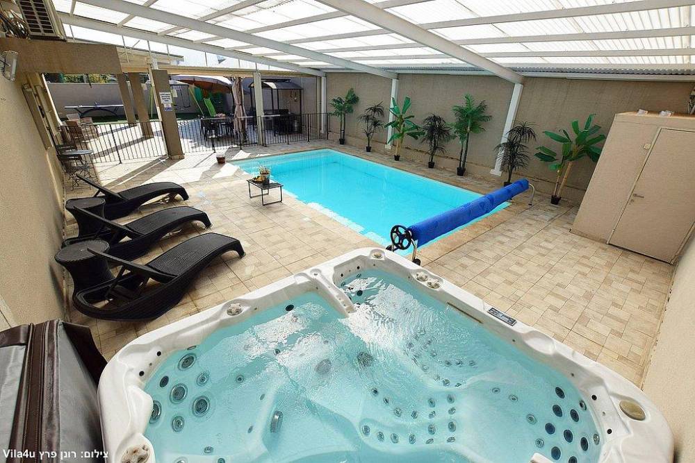 החצר? חוויה בפני עצמה: בריכה פרטית מחוממת ומקורה, ג’קוזי ספא, מיטות שיזוף, פינות ישיבה, שולחן פינג פונג, ברביקיו ומטבחון, ועוד שטח משחקים לילדים עם בית עץ, נדנדות וטרמפולינה.