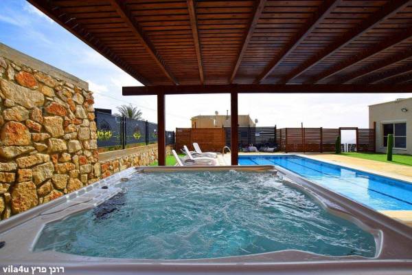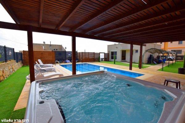 בריכת שחייה גדולה, מוארת לשחייה לילית ומקורה בפרגולה מוצלת. הבריכה בטיחותית ומגודרת למען נופשים עם ילדים.(מחוממת ומקורה )
