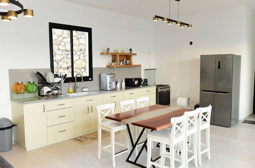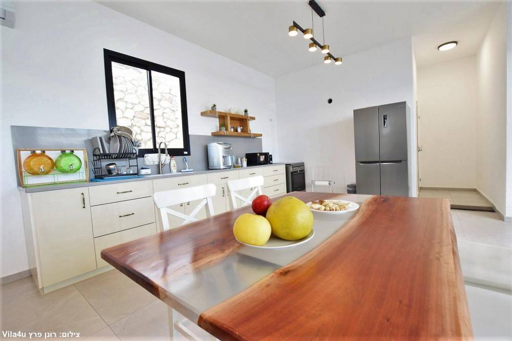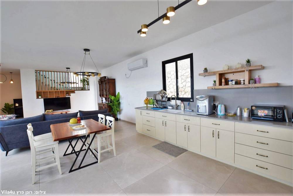 מטבח מאובזר קומפלט הכולל מקרר, מקפיא, כיור, תנור אפייה, תמי 4, קומקום חשמלי, כיריים גז, מיקרוגל, מכונת אספרסו, טוסטר, כלי אוכל והגשה