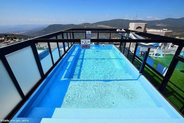 - גג עם בריכת שחייה מחוממת מקורה בנויה, 8*4 עם ג'קוזי זרמים מפל ותאורה, קיימת רשת הצללה מהשמש במתחם הבריכה