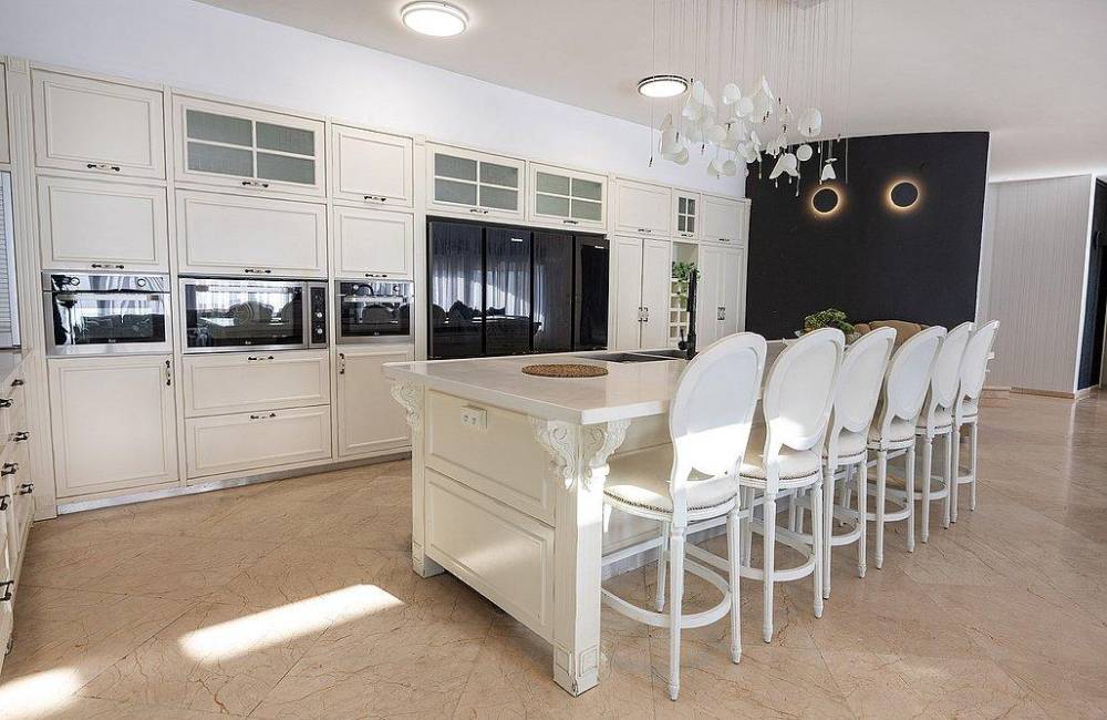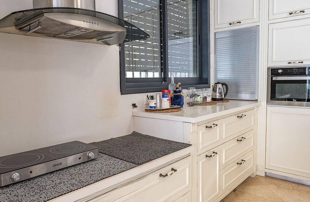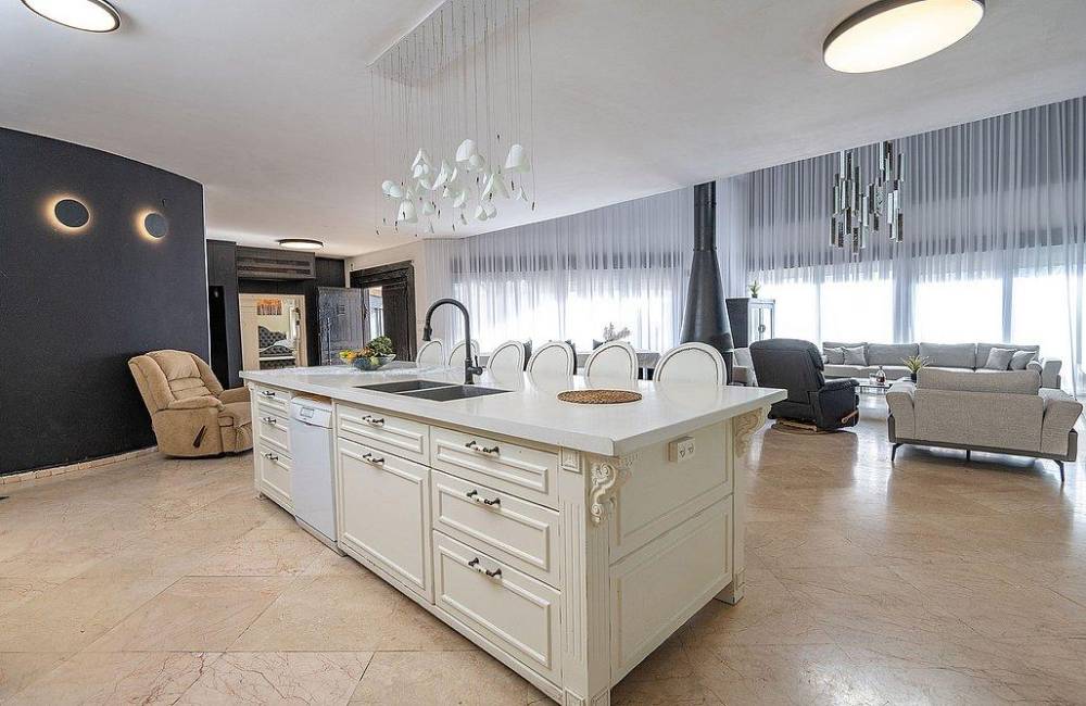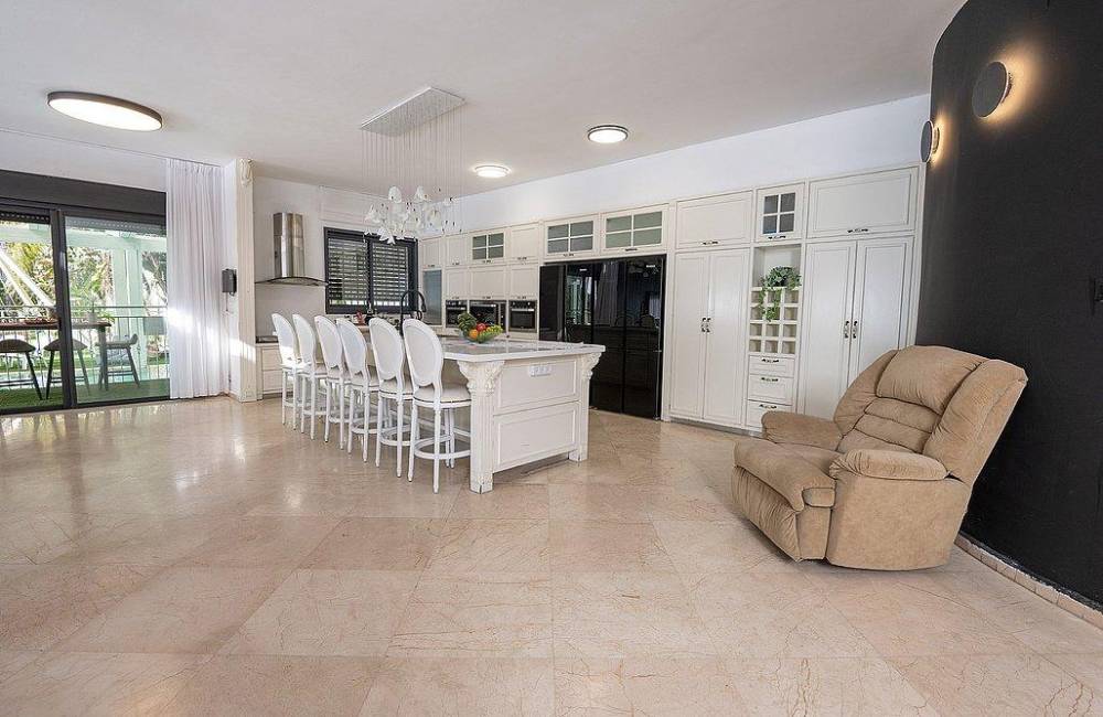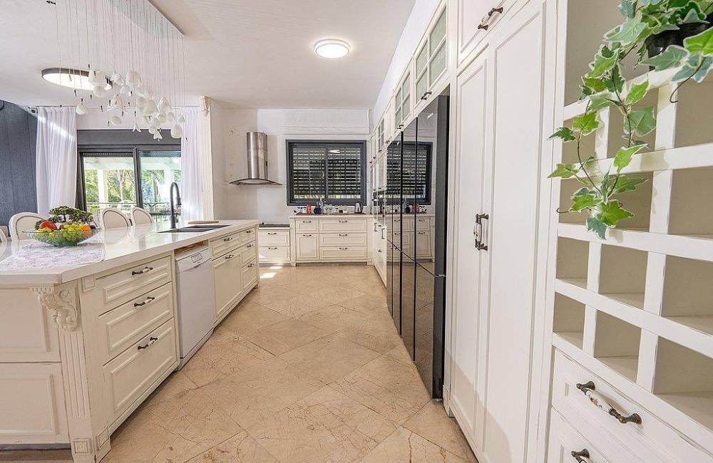 מטבח גדול ומאובזר ברמה גבוהה – כולל אי ישיבה, כיריים, תנור, מקרר כפול, מכונת קפה, כלי אוכל והגשה