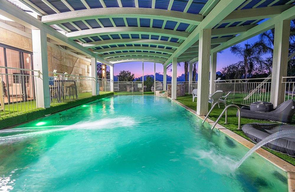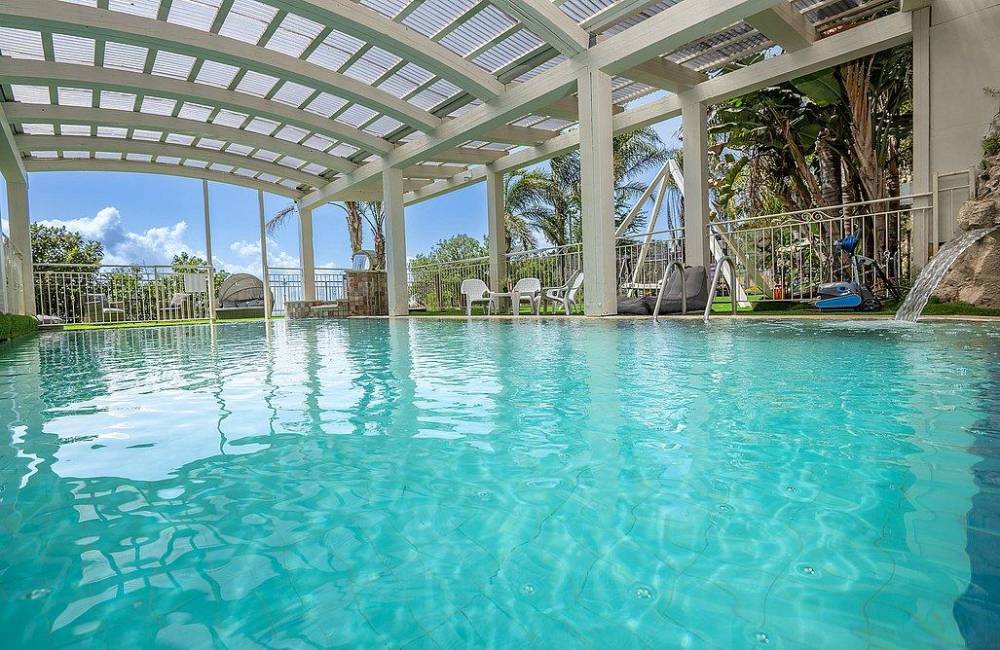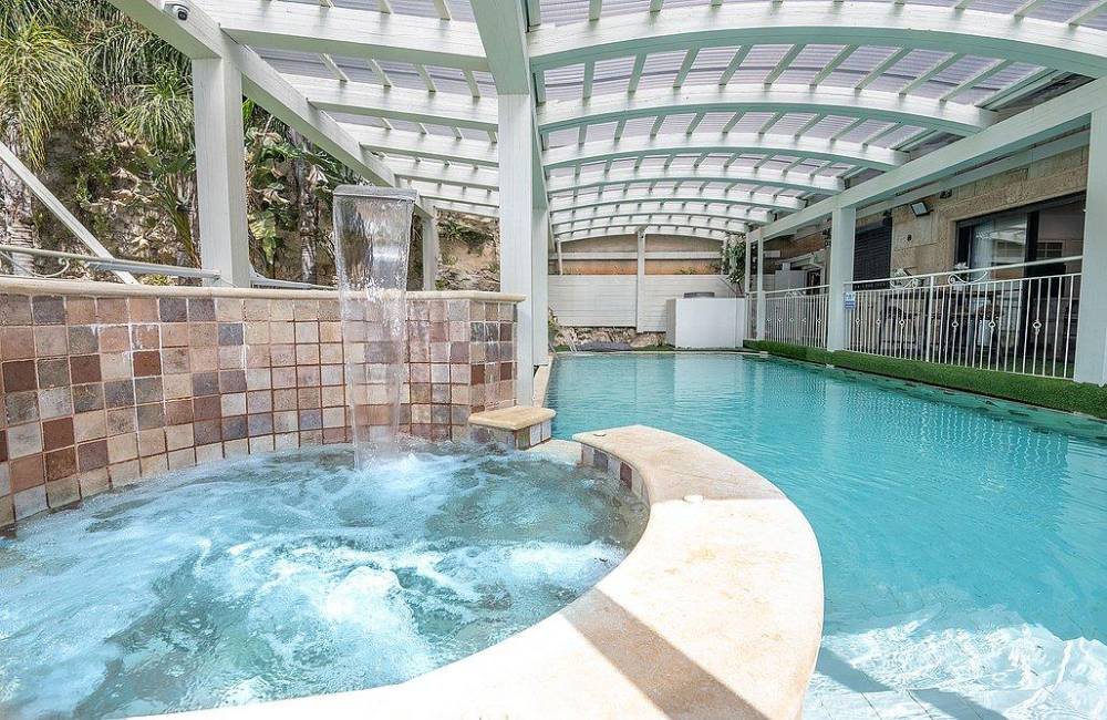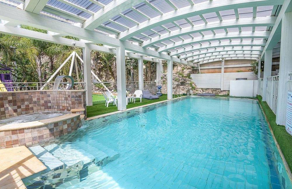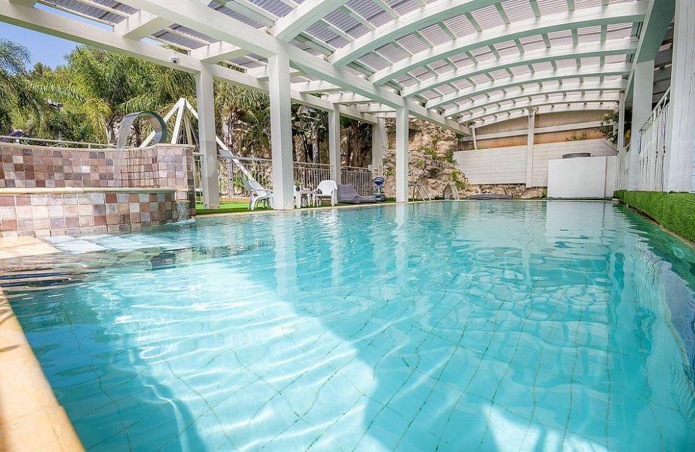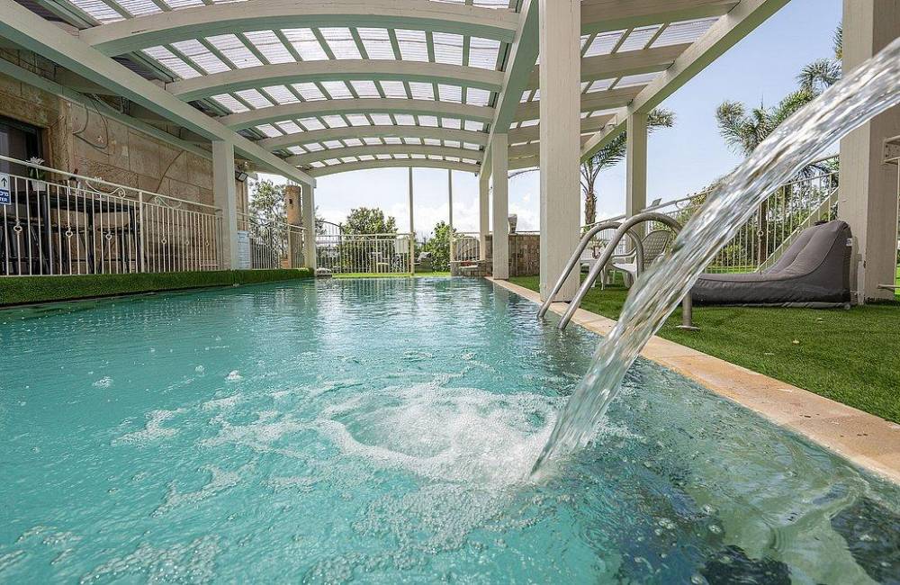 בריכת שחייה מחוממת מקורה ומגודרת עם מפל מים